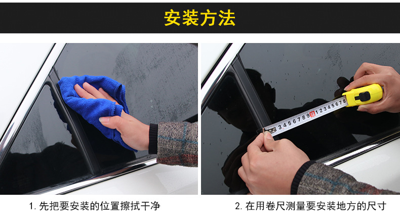 【安装方法】:清洁您要安装的地方,撕下背胶,贴上后力压数秒,2天内不要洗车以便巩固其粘性