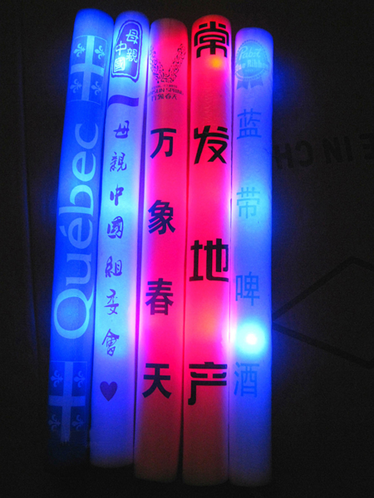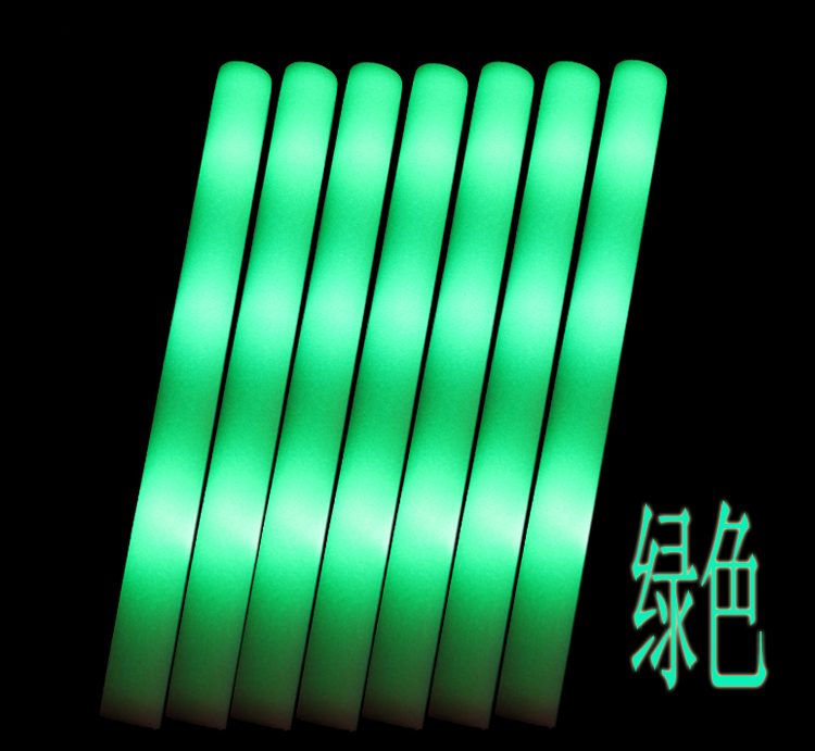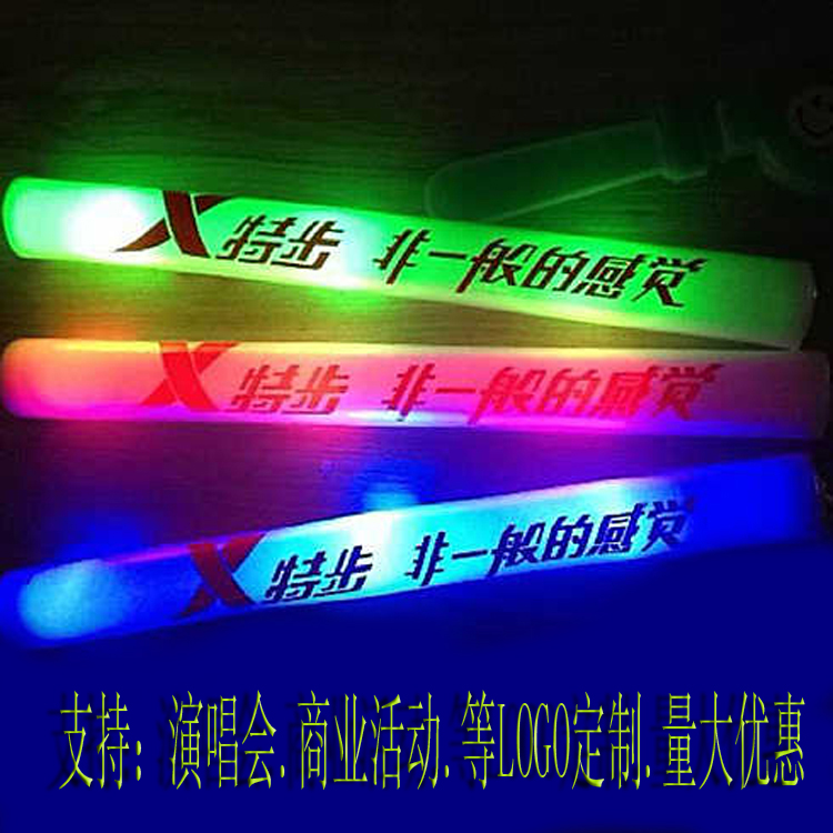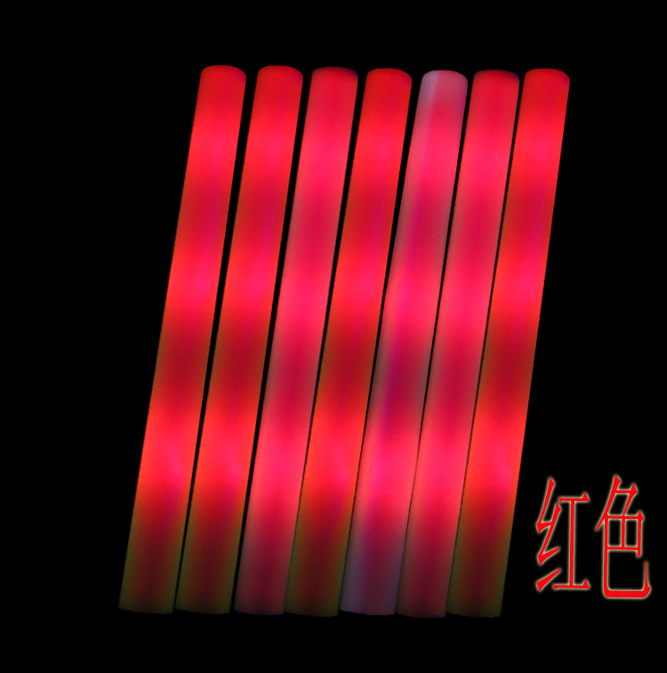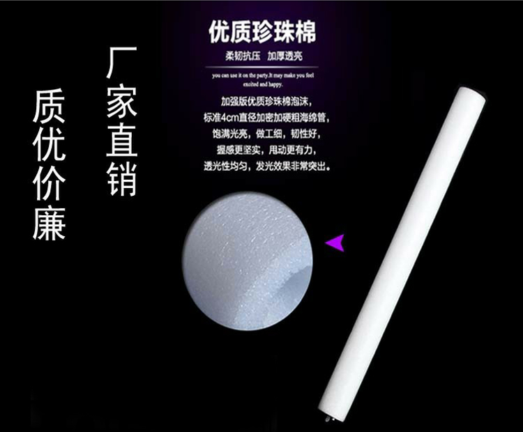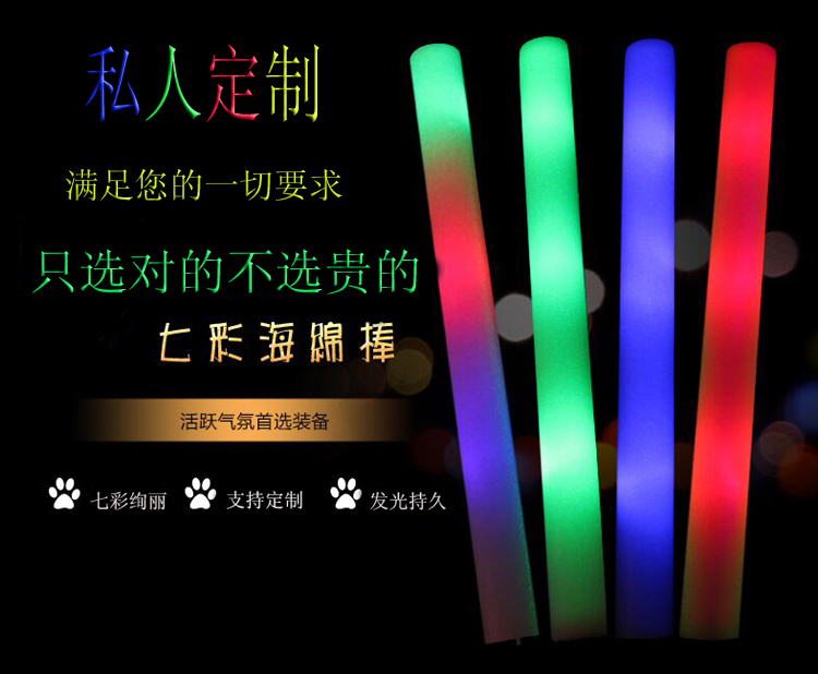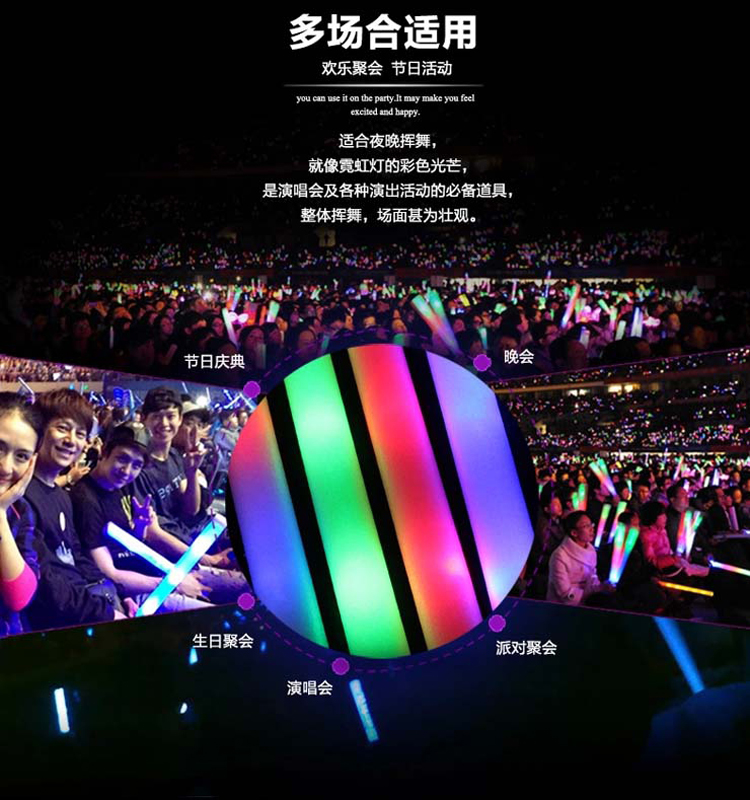 【使用说明】将海绵棒底部保护绝缘片抽掉,按下开关即可点亮,每按一次发光频率变化一次,共3种发光闪光效果。棒内LED灯透过海绵体发光均匀,尤其在夜晚挥舞,就像霓虹灯管发出彩色光芒,且非常节能环保。是各类演唱会及各种演出活动 新现场小道具,整体挥舞起来,场面甚为壮观。