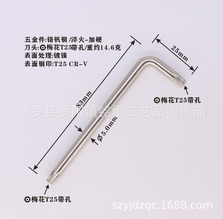 刀杆粗5mm,长边(T25梅花带孔)83MM,短边(T25梅花带孔)25MM,