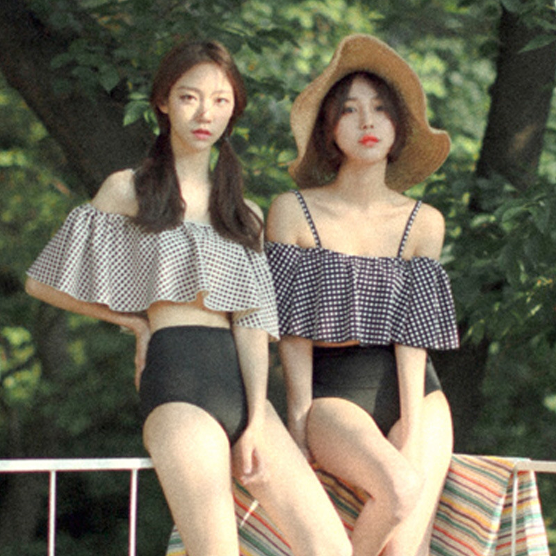 한 Mengyini 새로운 한국 스타일 섹시한 작은 가슴 푸시 업 작은 격자 무늬 분할 하이 웨이스트 비키니 수영복 1538