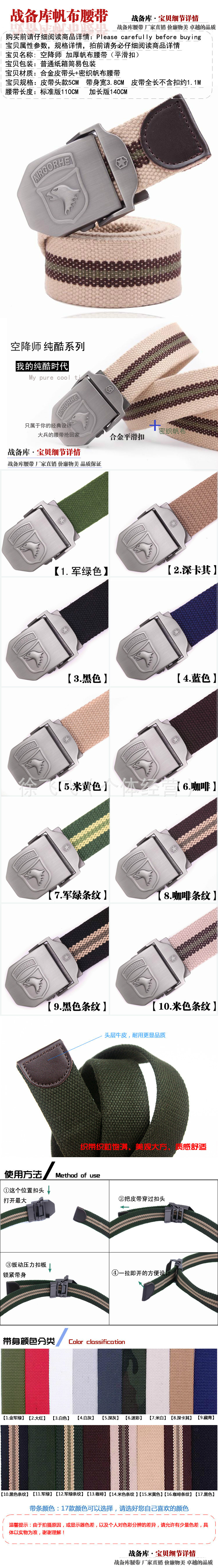 本产品所有产品均为实物拍摄,未加修饰,因相机和显示器原因,实物和图片的颜色可能存在差异(色卡的色差较小).另外每个批次皮料的颜色可能会有所改变,因为产品本身织的很厚很紧很密,带身摸到手上会有硬硬的感觉,但是这样才会结实耐用,这并非质量问题,绝对不会影响配带问题,请特别在意的买家谨慎购买.本店为专业做帆布腰带的厂家,有工厂,有实体店,可定做任何颜色的带身与扣头,欢迎亲们来样来稿定做加工。