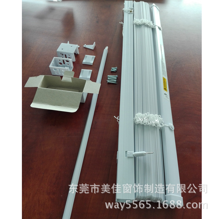 主要材料:帘片、帘片盒、导索或导轨、电机或摇柄。帘片材料主要有铝合金叶片、铝合金穿孔叶片。通过调整帘片角度来控制射入光线,帘片角度可调节至最合适的位置。