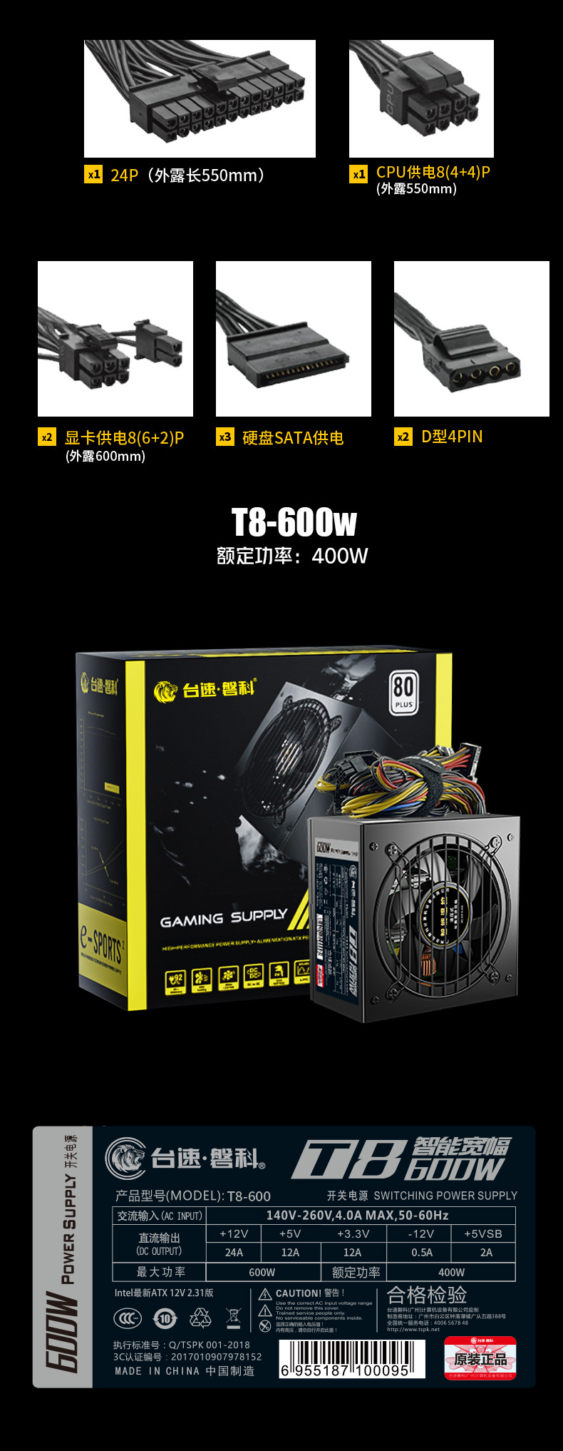T8 단일 디스플레이 스위치 피크 600W 정격 400W 데스크탑 컴퓨터 ATX 호스트 PC 전원 공급 장치