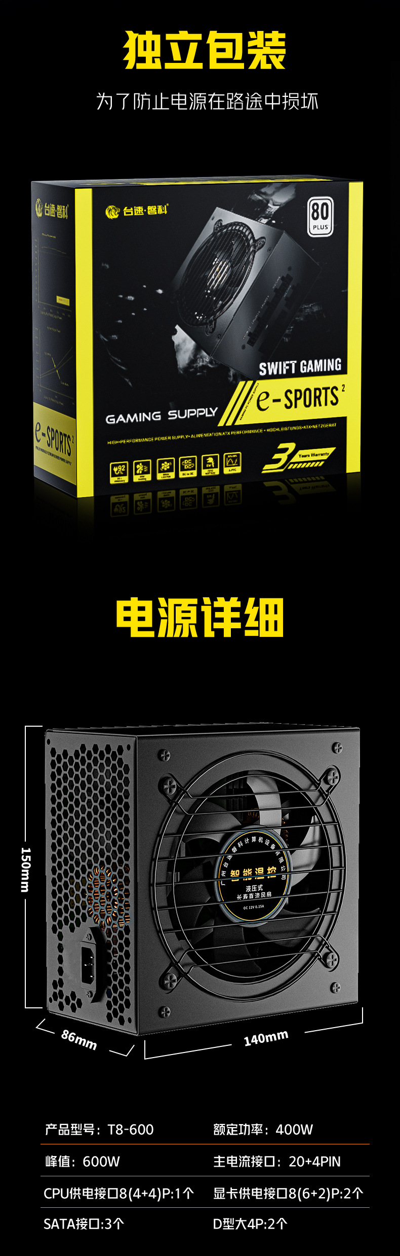 T8 단일 디스플레이 스위치 피크 600W 정격 400W 데스크탑 컴퓨터 ATX 호스트 PC 전원 공급 장치스토어 가기