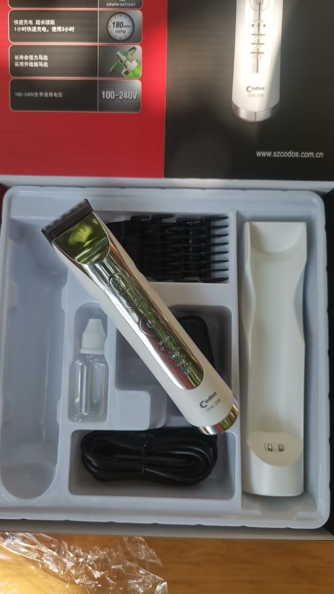 套装配件:(配梳用于调整推毛的预留长度,分别可留4个长度任意选择),充电器,清洁刷,油瓶.