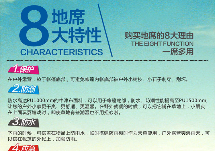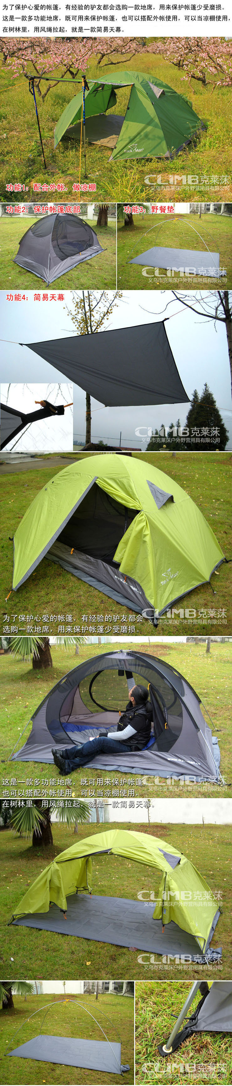 同时4角带孔也可以置于帐篷底布来起到防水防潮的作用