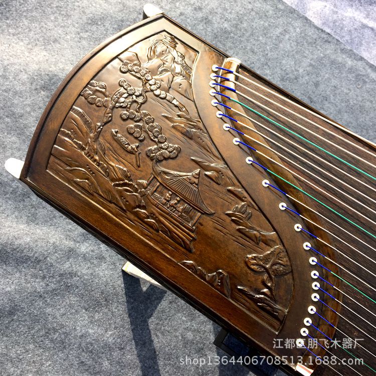 面板采用河南兰考一级桐木,框架是高档白松,德国进口钢丝制作的C类琴弦,采用纯手工工艺将龙腾图案与古筝融为一体。使用传统的大漆工艺。用料均经过严格处理:浸泡去渣,储藏风干,精雕细刻,经工匠精心布局、定位、手工雕刻、打磨完成。