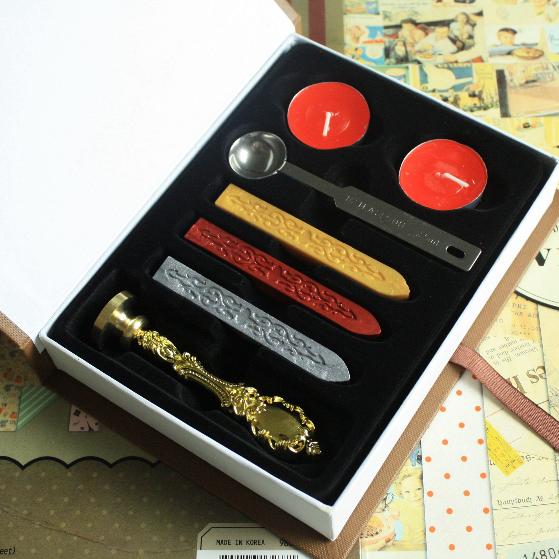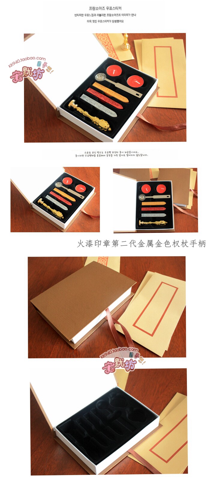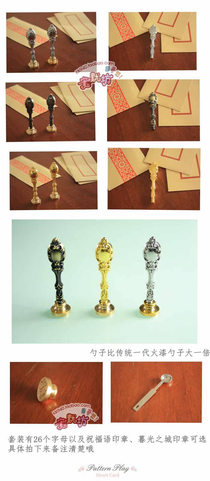复古光耀手柄火漆印章一枚+金色、银色、金红三色火漆蜡各一根+一个 大号勺子+两个红蜡