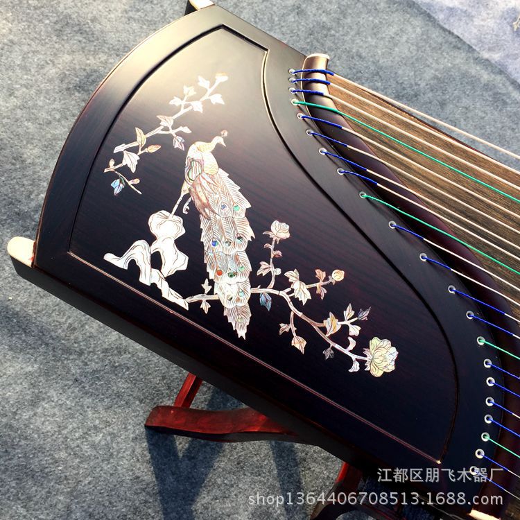紫檀挖嵌孔雀款古筝属于演奏级古筝,音色清脆明亮,音质醇厚,纯清水油漆处理。用料均经过严格处理:浸泡去渣,储藏风干,技术领先,亚光制作,工艺严谨,色泽赤朱,精雕细刻,经工匠精心布局、定位、采用高档的海贝手工挖嵌、打磨成各种栩栩如生的图案。