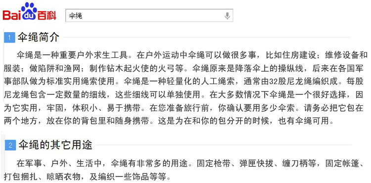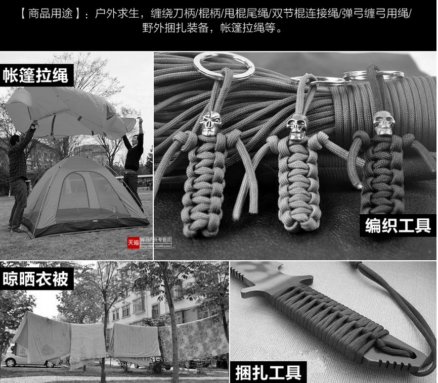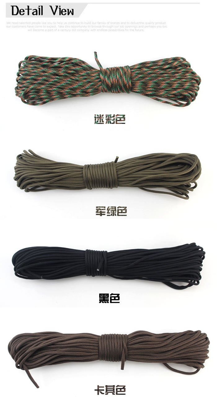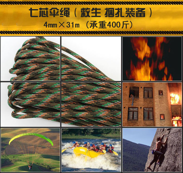 七芯伞绳 按标准要求制作,进口设备绕制,直径4毫米,单绳拉力在400斤。绳体纺织得相当浑圆紧密,表面纹理相当细致,耐磨性相当好,频繁摩擦后也不起毛。
