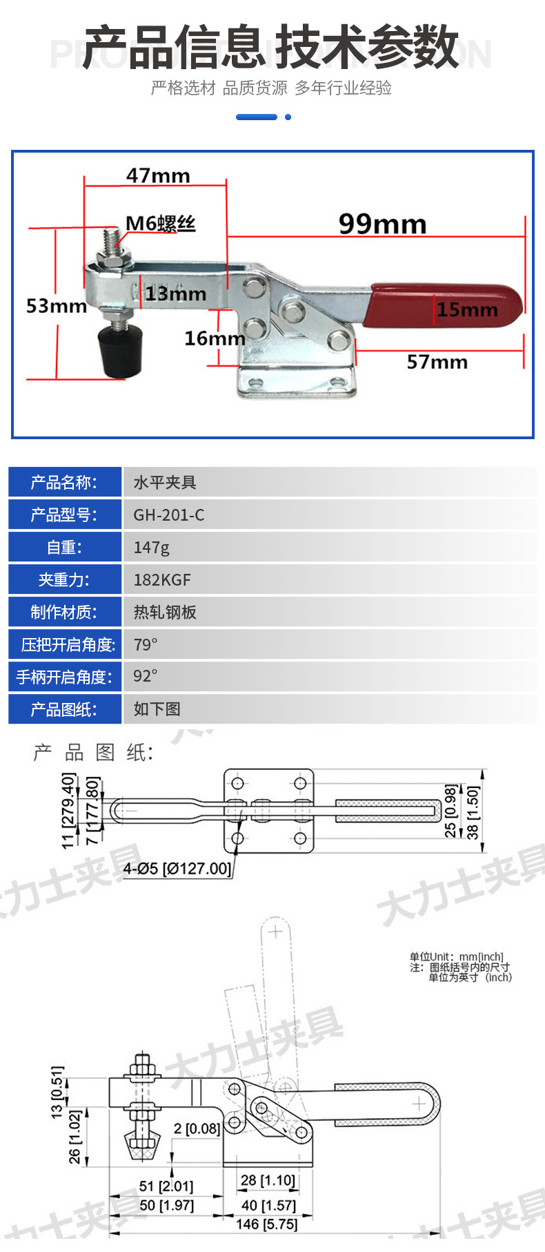 헤라클레스 퀵 클램프 GH-201-C-WDC 수평 퀵 클램프, 182kgf의 고정력, 목공용 클램프
