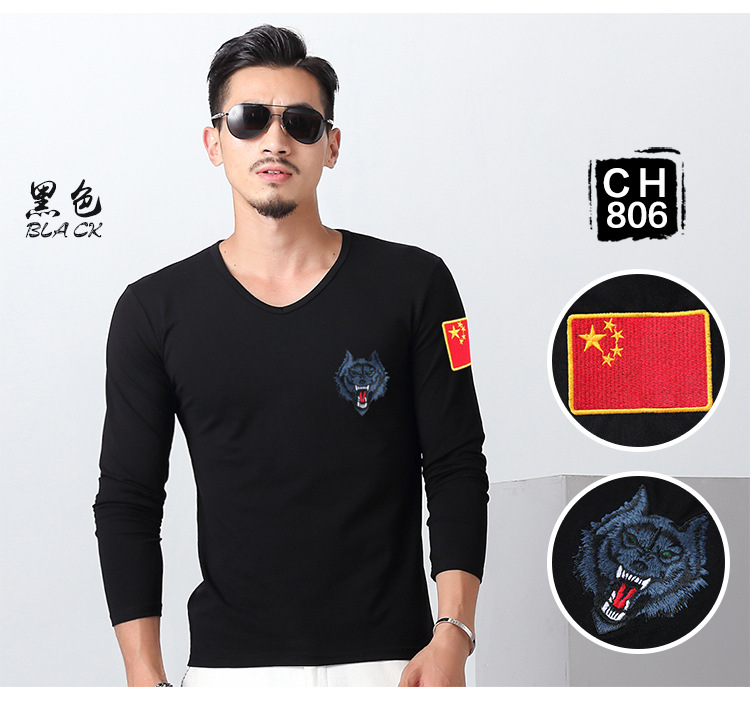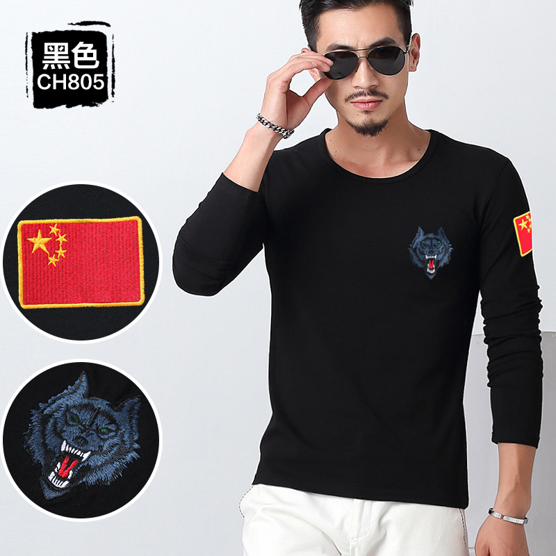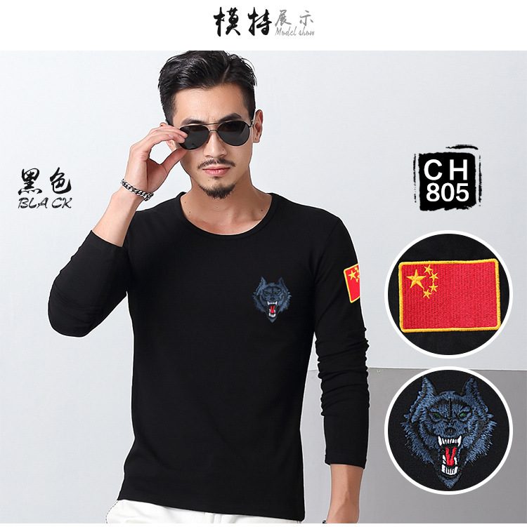 가을 자수 중국 슬림 핏 육군 팬 늑대 머리 물리적 긴 소매 티셔츠 바디 남성용 기본 도매 판매