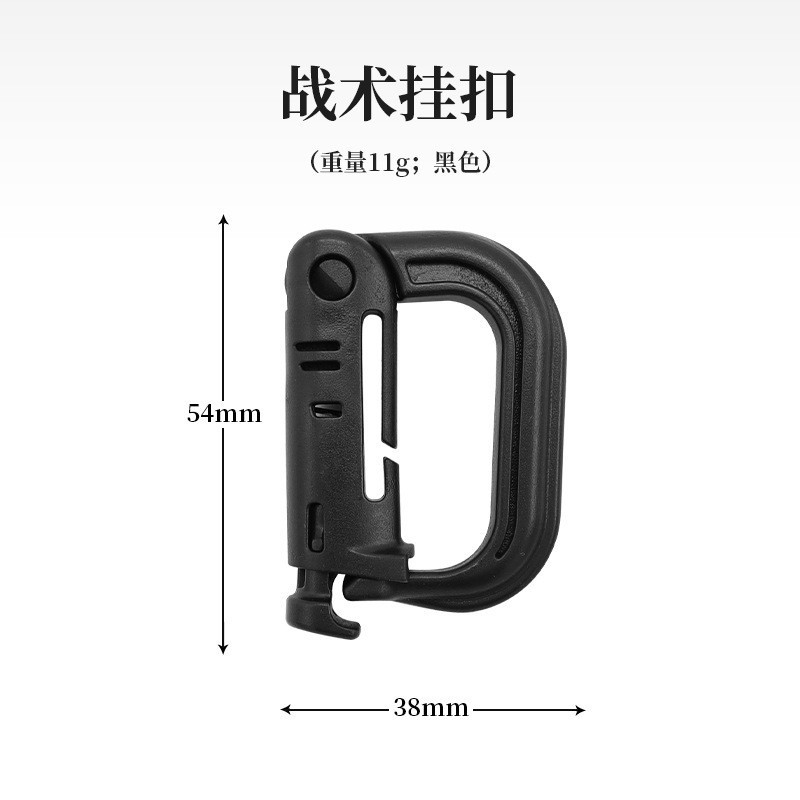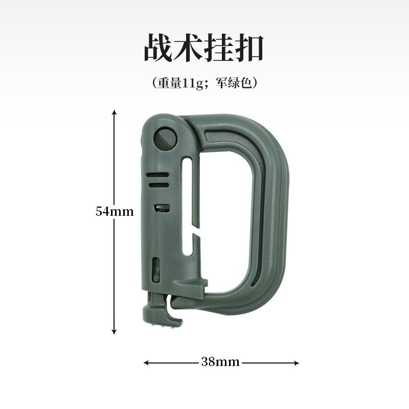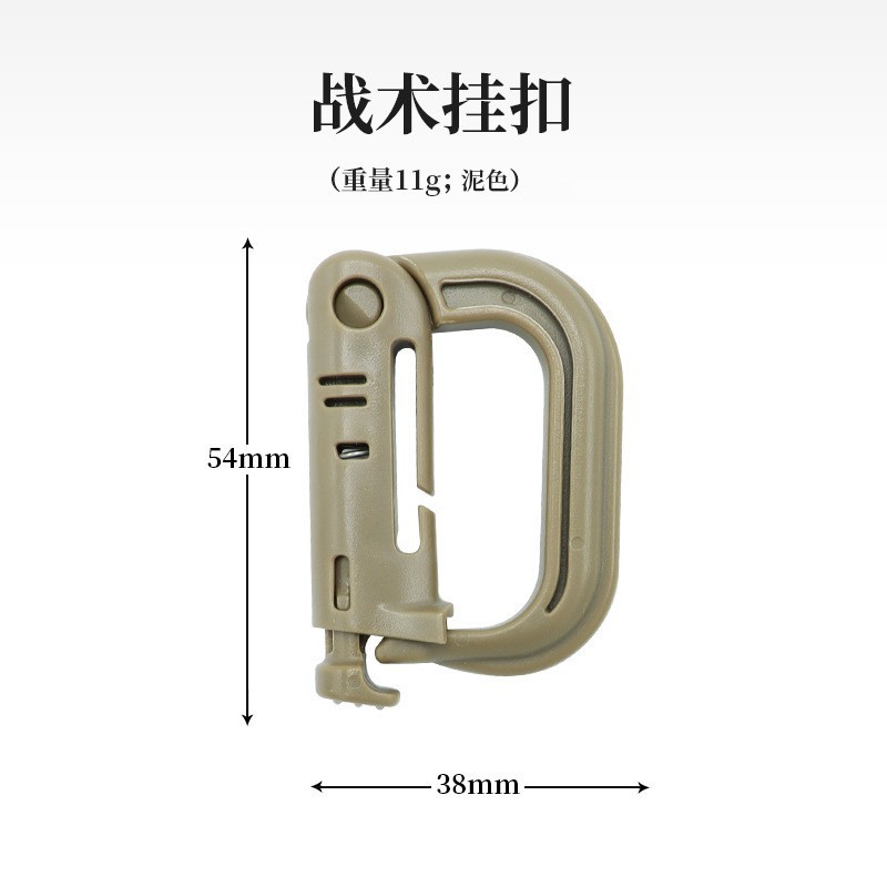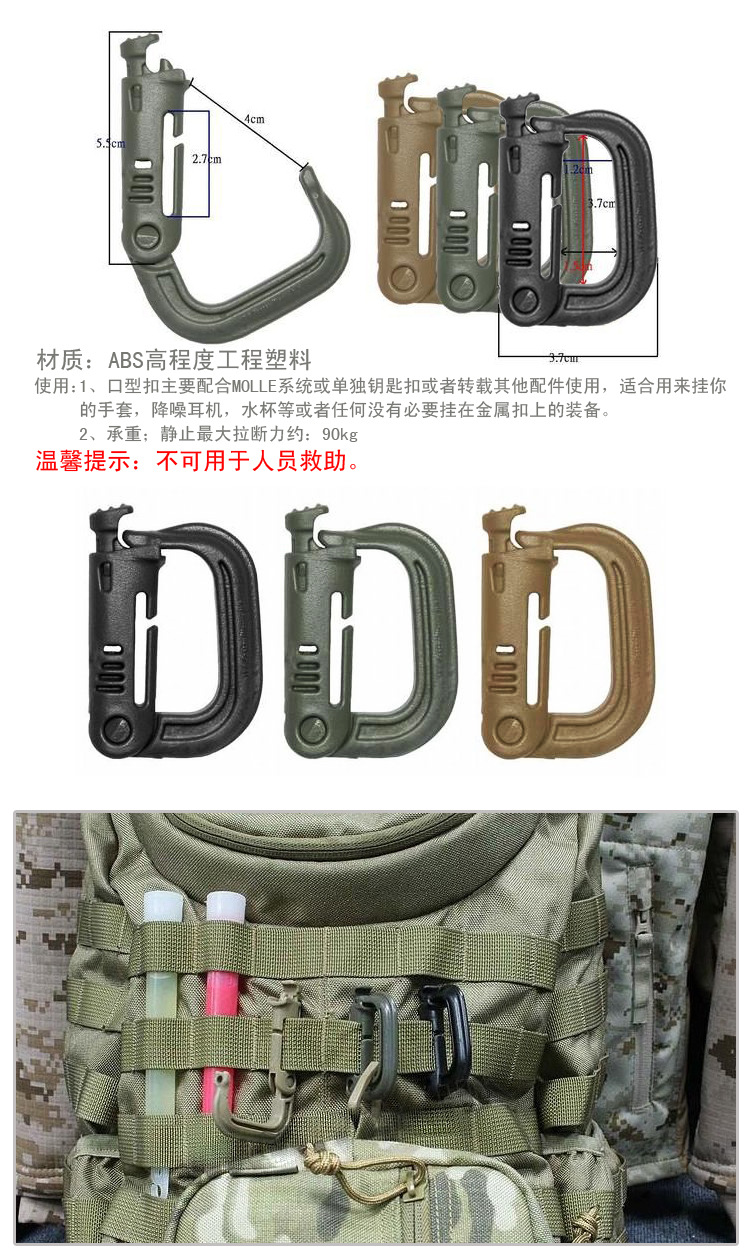特点;使用于约1英吋宽度的织带上,可以扣在如战术背心、背包、腰包等MOLLE系统的装备上,做为短绳、工具和辅助部份的附件。