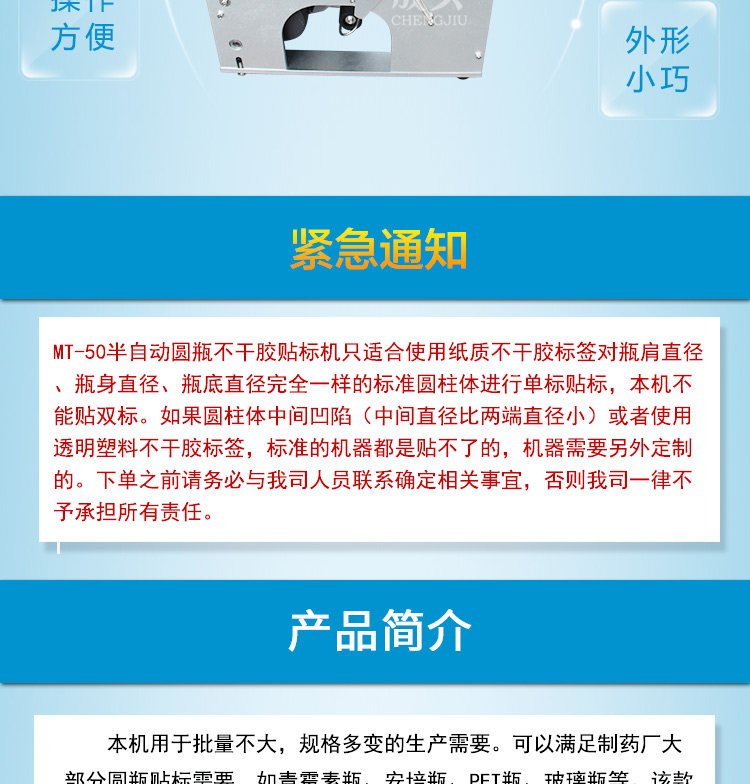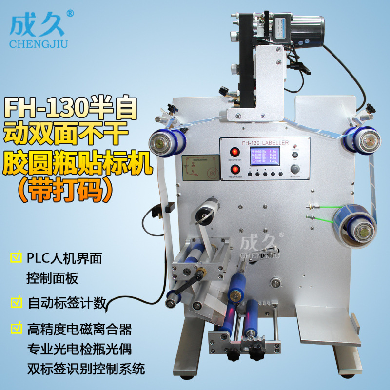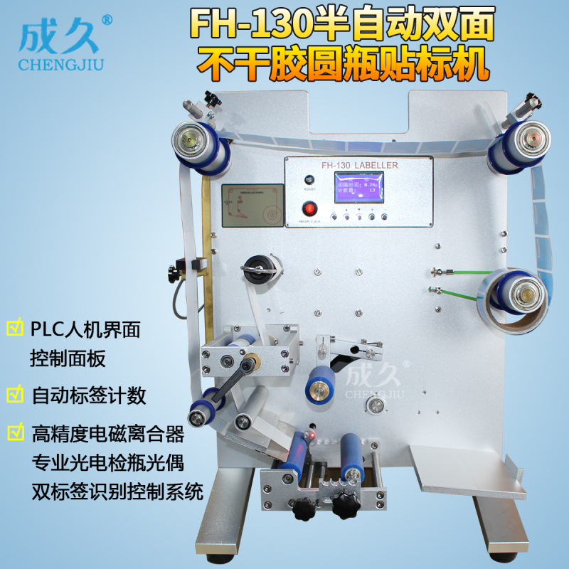 本机用于各种瓶子进行半自动单面、双面不干胶贴标。可对特长的不干胶标签进行贴标。