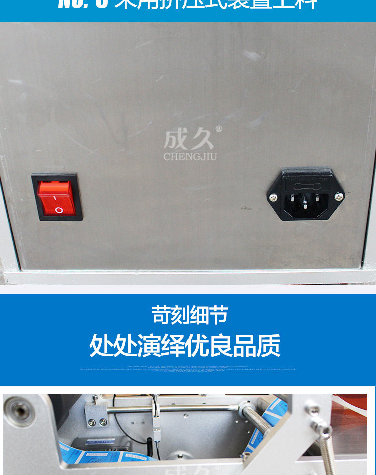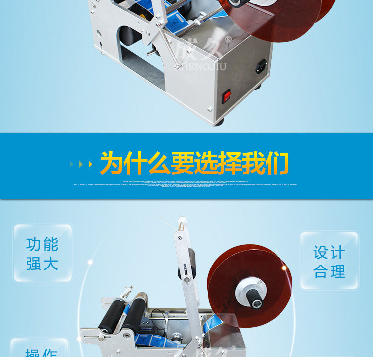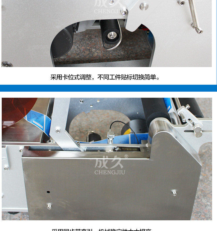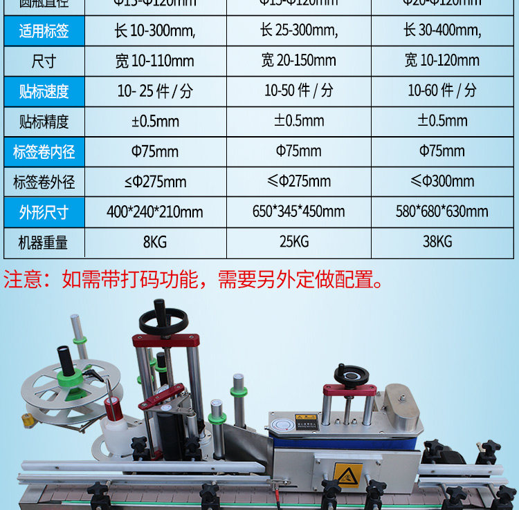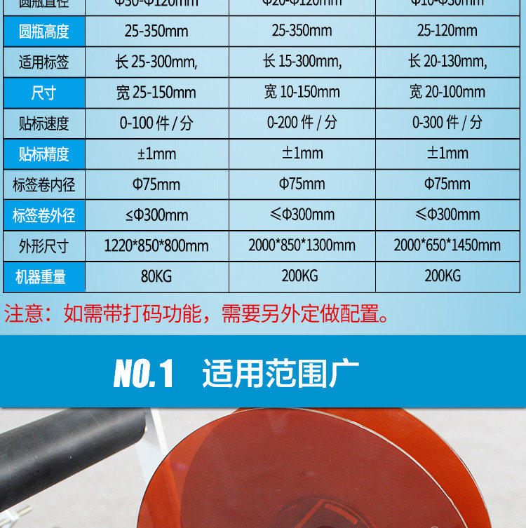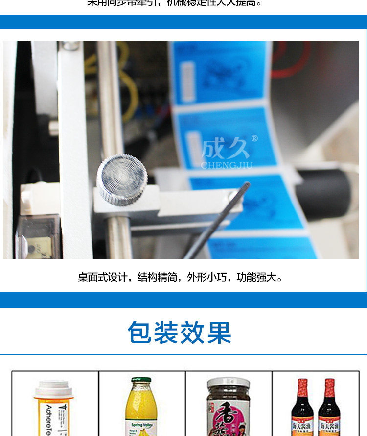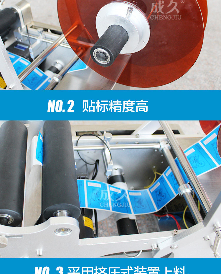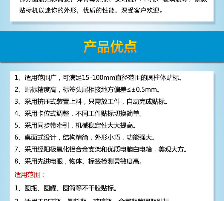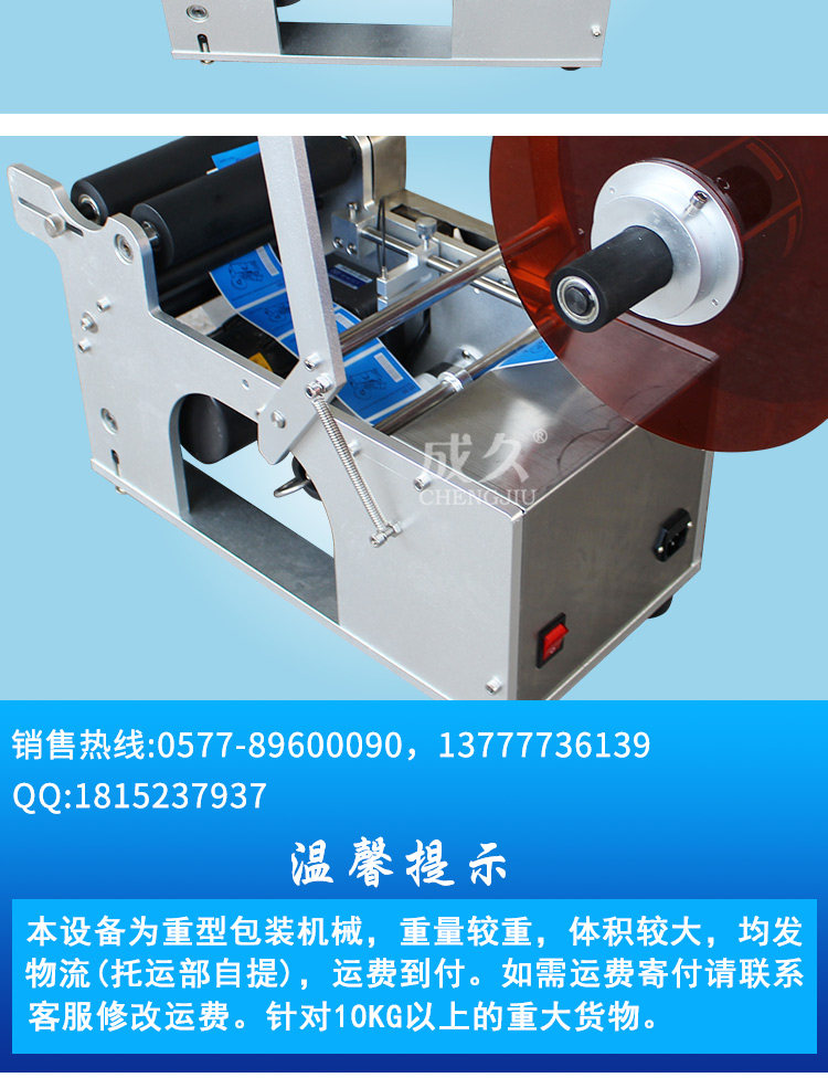 使用"NAIS"PLC控制,"SICK"标签专用电眼跟踪贴标,美观轻便。外形设计美观轻便,还可根据客户要求灵活设计,量身订做。低成本,高效率。若使用透明标签需加装专用透明标签电眼选项。