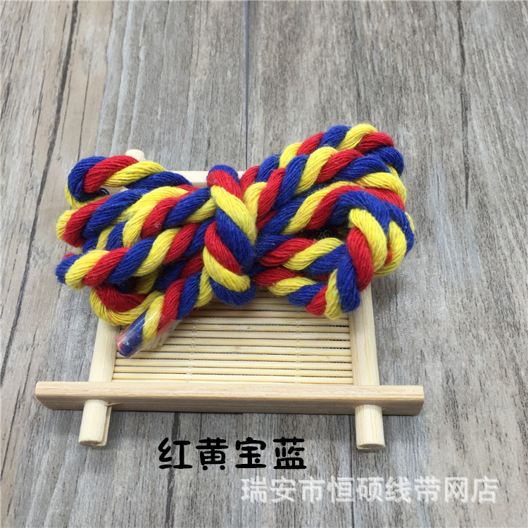 绳子由不同三股拧成,每一股有几十根棉纱组成。绳子材质为全棉纱。