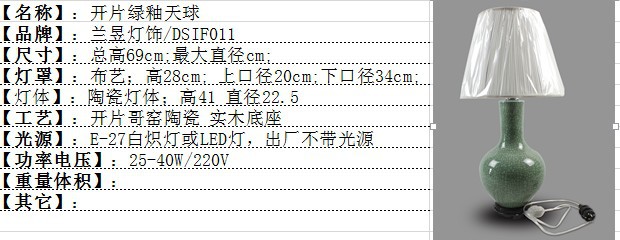 产品名称 :DSIF011景德镇 陶瓷  开片绿釉天球 台灯 灯具 灯饰 家居摆设