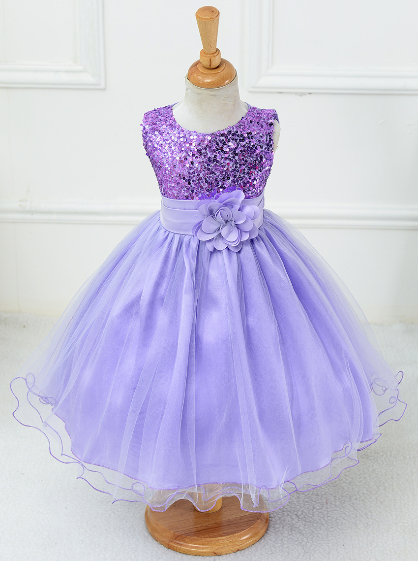 紫色女童长款礼服儿童钢琴走秀表演服花童短袖公主蓬蓬裙批发630