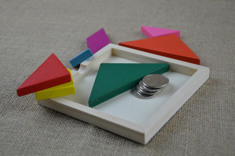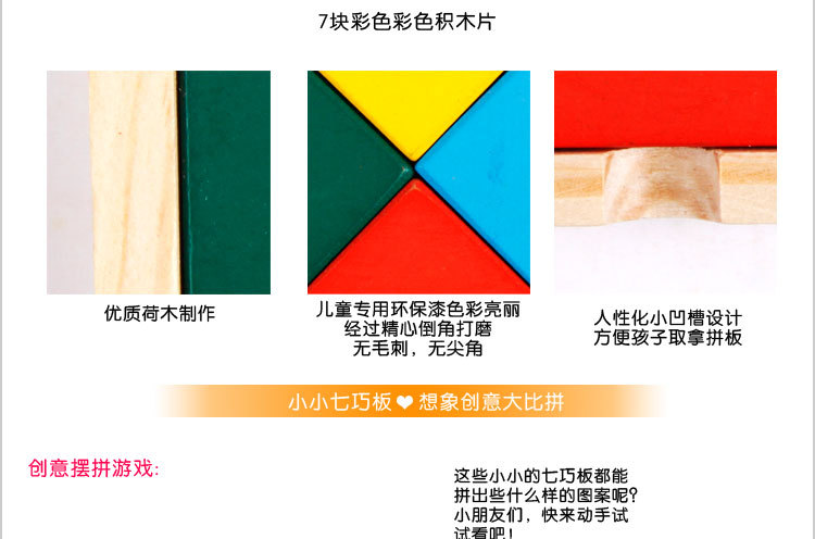 一种玩法是将七块几何积木片从盒中倒出,不看图纸再将它们严整地拼放回盒中。另一种则是按图纸摆放各种图形。当然你也可以发明更多新式的玩法,并且可以和家人来个计时赛,看看谁拼得又快又好。木质玩具,以其轻巧、手感好、容易操作的特点而得到了成人以及家长和孩子的喜爱。