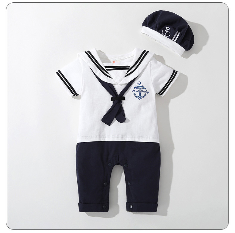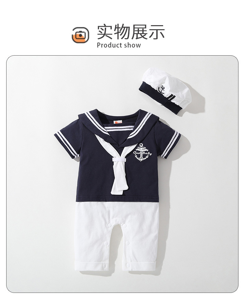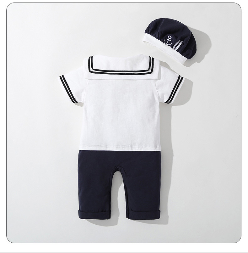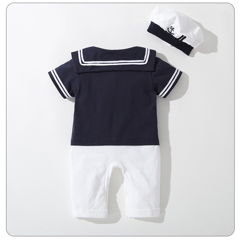 대외 무역 아동복 도매 직접 공급 해군 바람 모자 가방 방귀 아기 점프 슈트 여름 반팔 남아 여름 의류