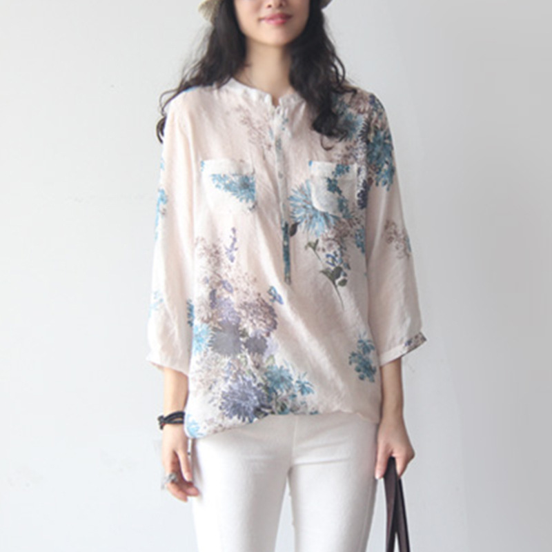 2024 새로운 봄과 여름 신선한 대형 면화와 리넨 꽃 느슨한 중간 길이 소매 한국 스타일 예술적 여성 셔츠스토어 가기