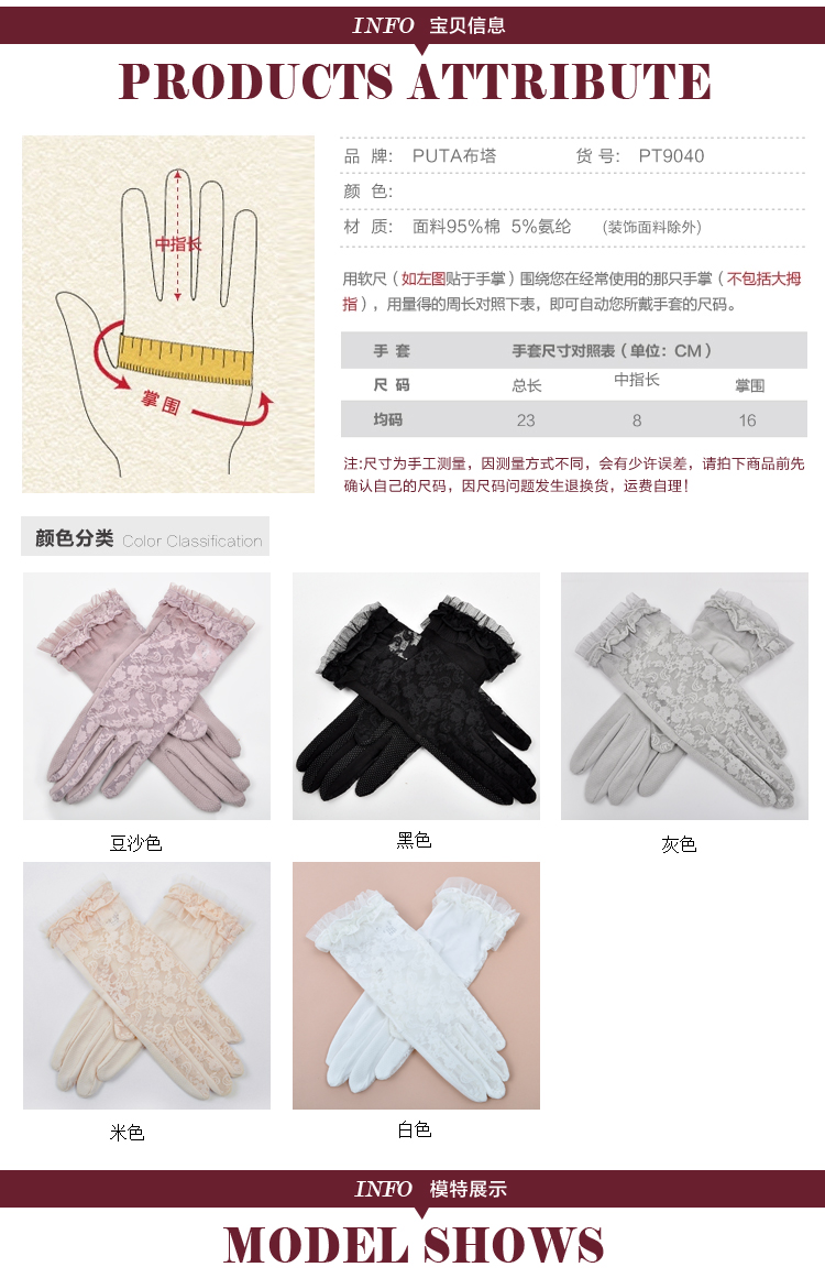 부타 정품 태양 보호 레이스 장갑 여성 패션 여성 운전 얇은 미끄럼 방지 장갑 PT9040스토어 가기
