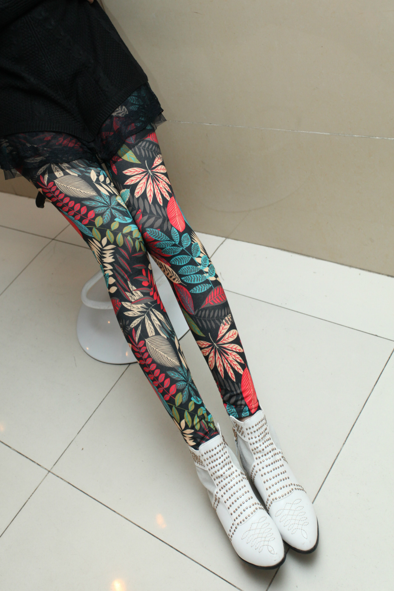 9834 새로운 유럽과 미국 스타일 열대 우림 프린트 스트레치 레깅스 밀크 실크 메이플 리프 아우터 착용 발목 길이 바지스토어 가기