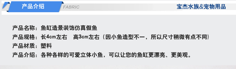 本链接4.5cm漂浮塑料鱼系列产品拍下没有联系我们的,我们默认发货是发现货款式的鱼,一般我们是混款搭配发货的哦,若您需要同款请联系客服。