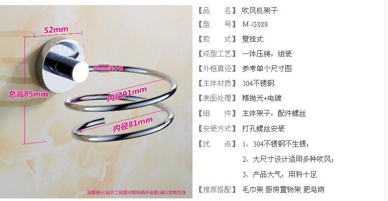 不锈钢圈的吹风机架 内包装尺寸12*12*12 厘米 0.2公斤 带包装