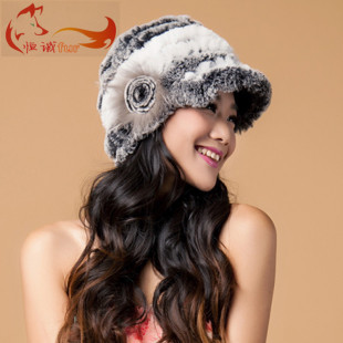 獭兔毛护耳编织帽子加厚保暖狐狸花拼色毛线皮草鸭舌帽冬季女款
