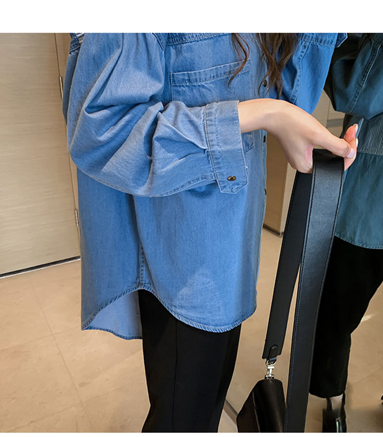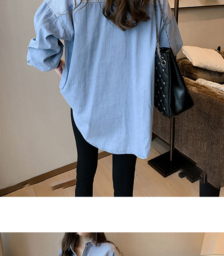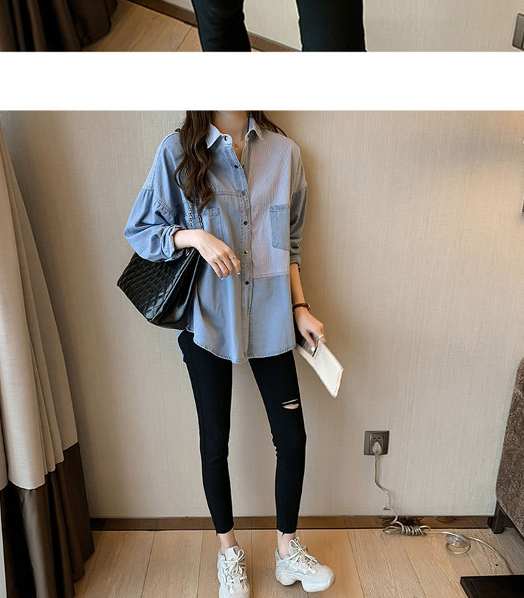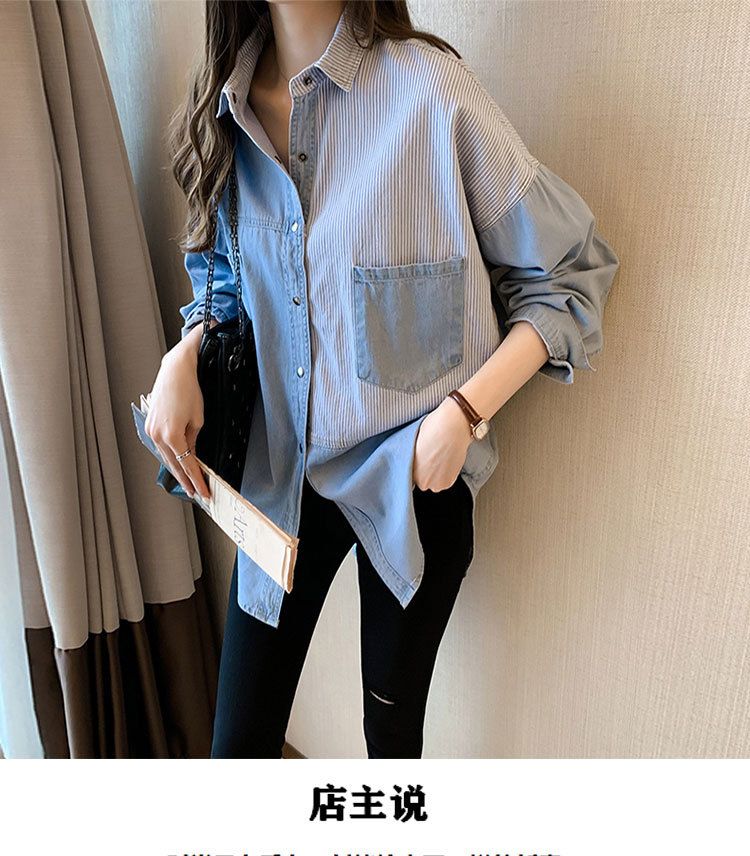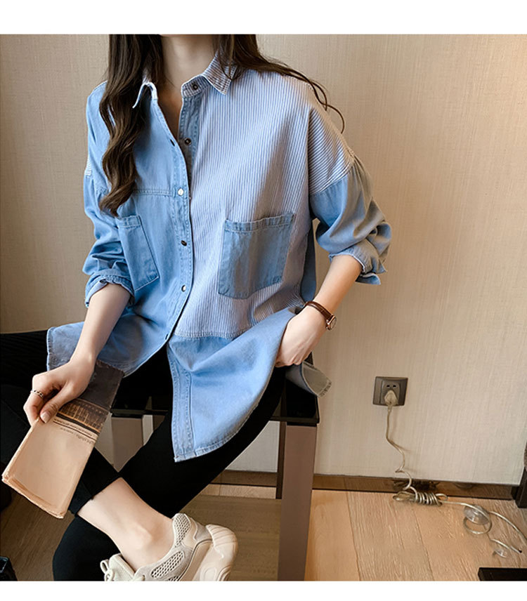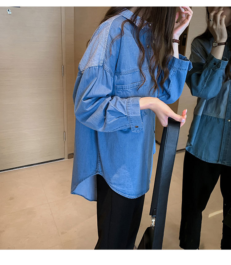 가을 2023 여자의 새로운 데님 셔츠 주의 기계 긴 소매 디자인 감각 학생 티셔츠 느슨한 외국 스타일 탑스토어 가기