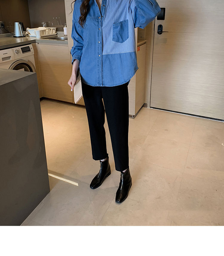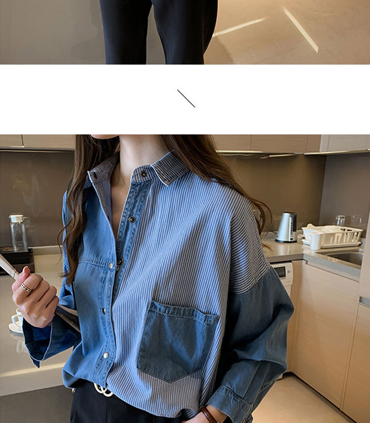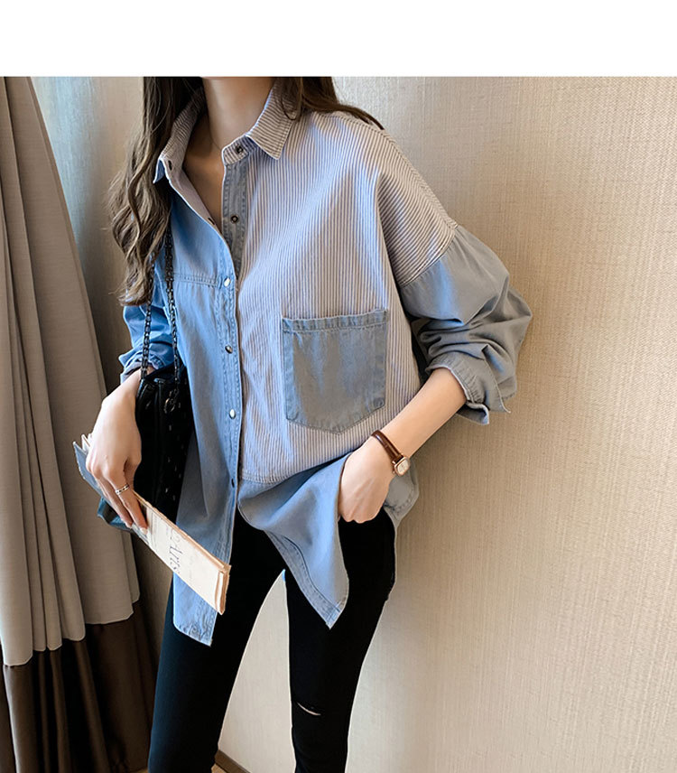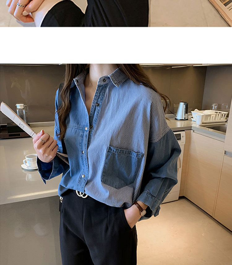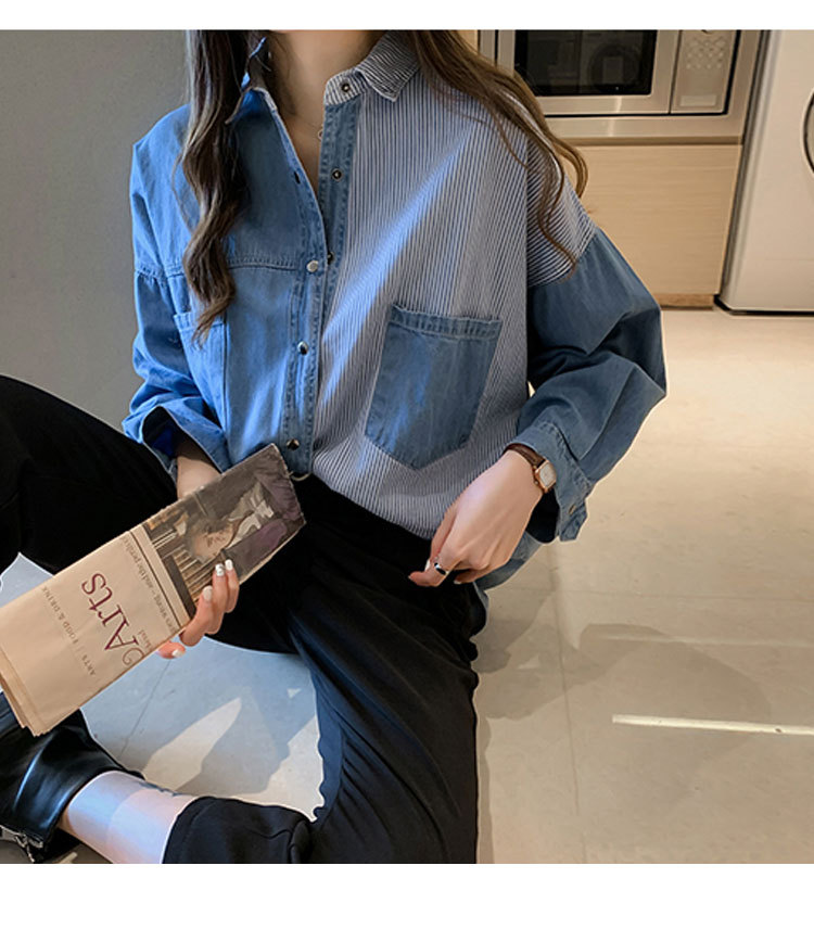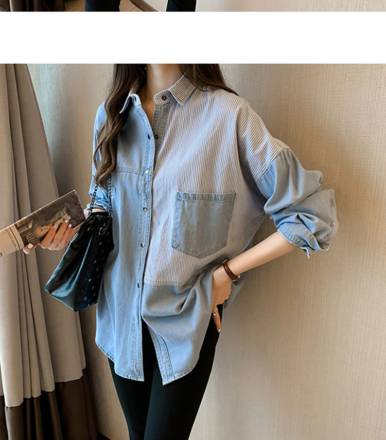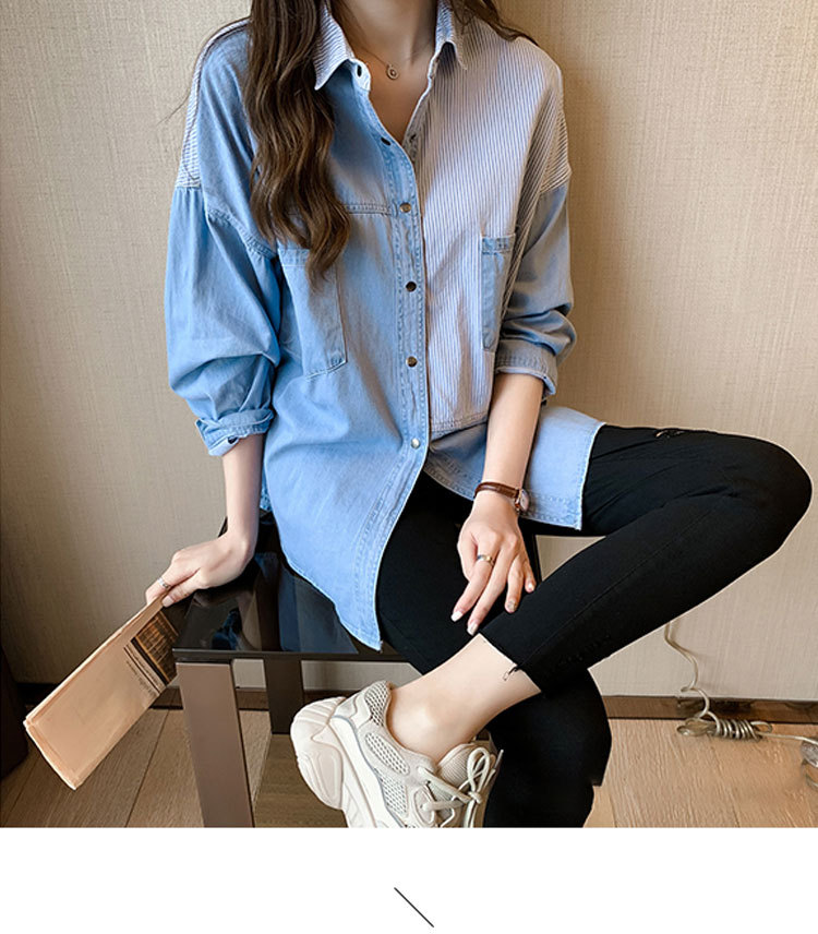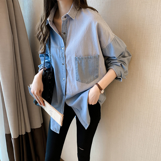 가을 2023 여자의 새로운 데님 셔츠 주의 기계 긴 소매 디자인 감각 학생 티셔츠 느슨한 외국 스타일 탑