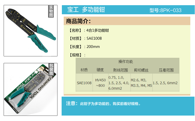[대만 Baogong] 4-in-1 다기능 펜치 와이어 스트리핑 전단 압착 펜치 와이어 스트리핑 펜치 8PK-033스토어 가기