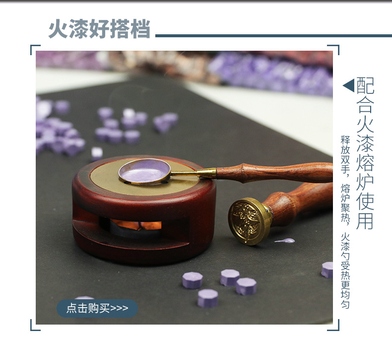 把火漆蜡粒几粒放在专用的勺子里,用蜡烛烧溶化,