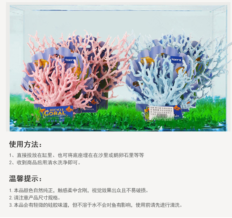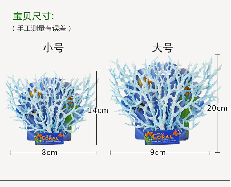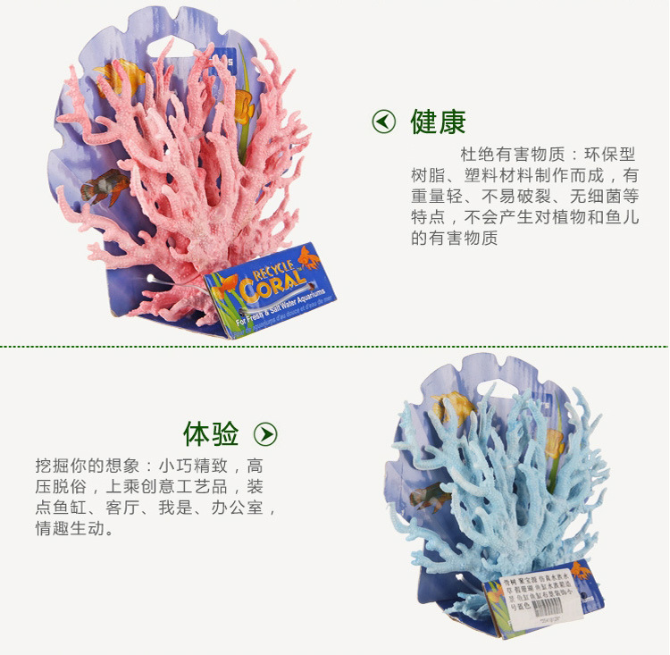 水族箱里的仿真珊瑚都是用对水质没有 影响的环保材料PU.PVC.树脂制做的。如果您只是用珊瑚来给水族箱做一般装饰,用仿真珊瑚应该是不错的选择:规格:大号高19厘米,总宽约26厘米左右,重约135克,
