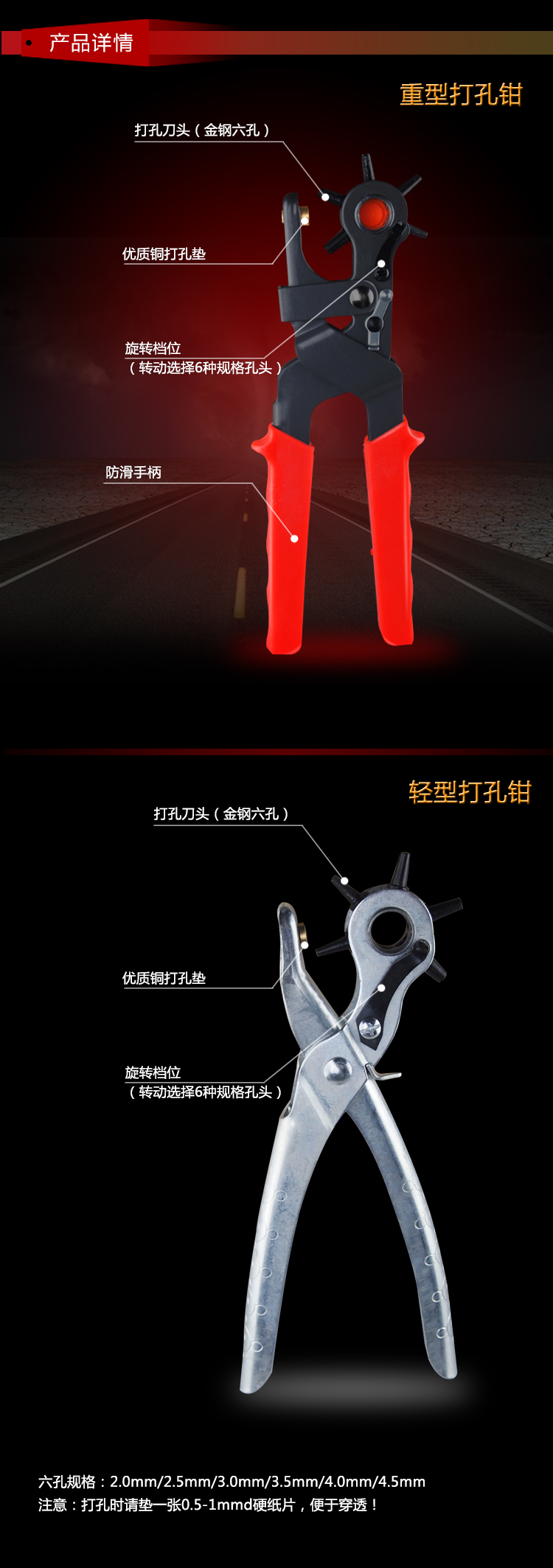 可打六种圆孔,打孔尺寸为2mm/2.5mm/3mm/3.5mm/4mm/4.5mm(转动头部即可调整所需打孔的尺寸,带数字标提示)。