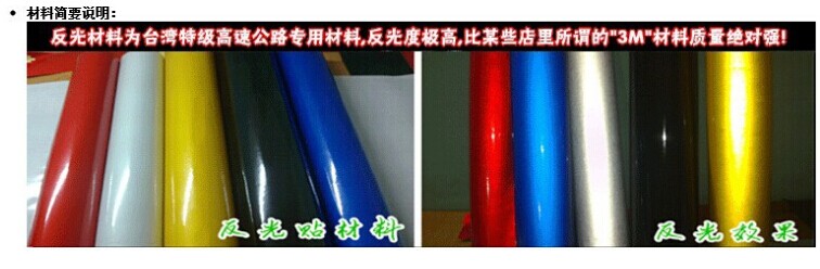 反光并非自发光或者夜光!反光材料的贴纸在自然光下颜色较为深一点,在光源的反射下会变成较浅的颜色。如反光白色,在自然光下的颜色非纯白,而是有点像银灰的银白色,只有在黑暗的环境中有光源的照射才会变成耀眼的纯白色。反光贴纸很炫而且可以起到警示作用,类似于警示牌那样!