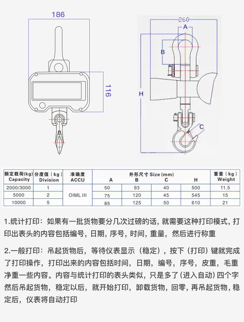 • E 무선 인쇄 교수형 스케일 OCS-5T