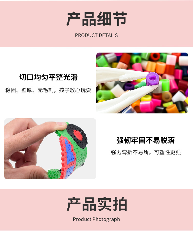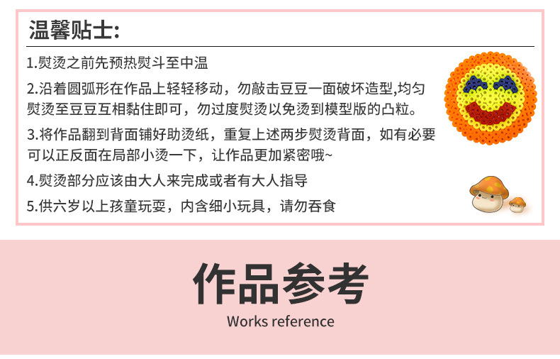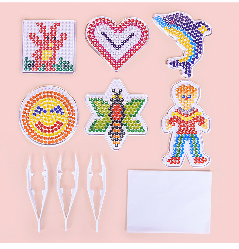 产品内容:5mm拼豆数量约9000颗+模板6个+彩卡6张+塑料夹子3个+助烫纸2张+说明书1张