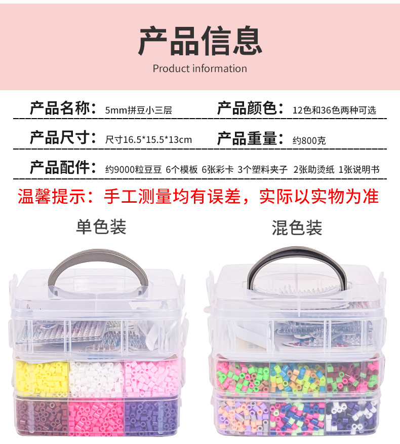 产品名称:5mm拼豆小三层套装(单色12色和混色36色两款可选哦~)