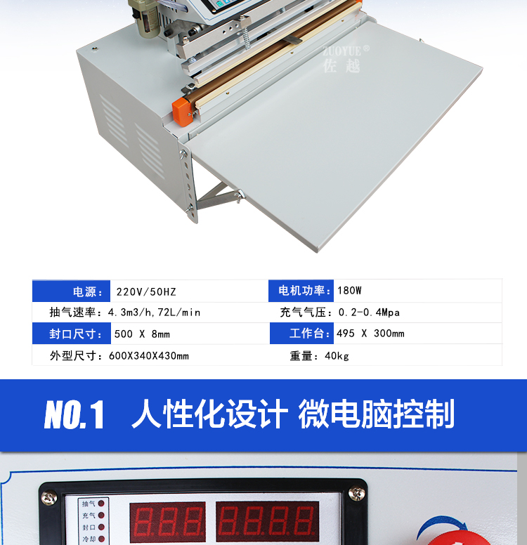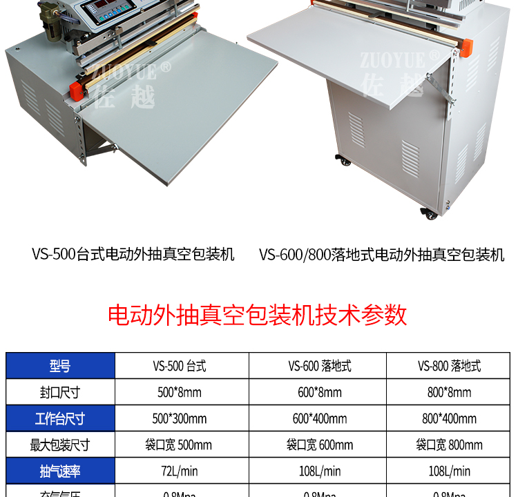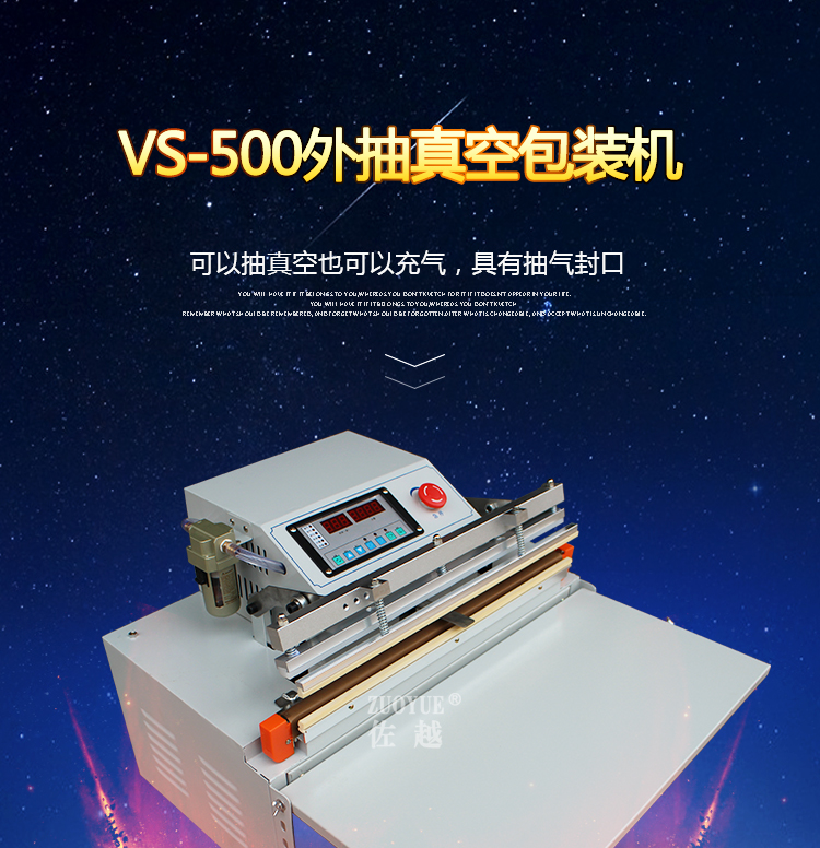型号:VS-600落地式电动外抽式充气真空包装机采用先进技术集真空、封口、充气多种功能于一体。 工作台可根据待包装物的厚度调整高度,不受产品外型、尺寸的限制,特别适合大件或形状怪异的物体的真空包装。控制面板采用新型按钮,热封温度、物品包装的真空度、气嘴伸出时间等均可自由调节,是目前内抽式真空包装机所无法替代的新型真空包装机。先设定包装物所要的技术参数,工作时只需踏下启动开关,即按自动程序完成真空包装的全过程。此款真空机适用的包装材料为各种复合薄膜如聚脂/聚乙烯、尼龙/聚丙烯、聚丙烯/聚乙烯、聚脂/铝箔/聚乙烯、尼龙/铝箔/聚乙烯等复合材料。