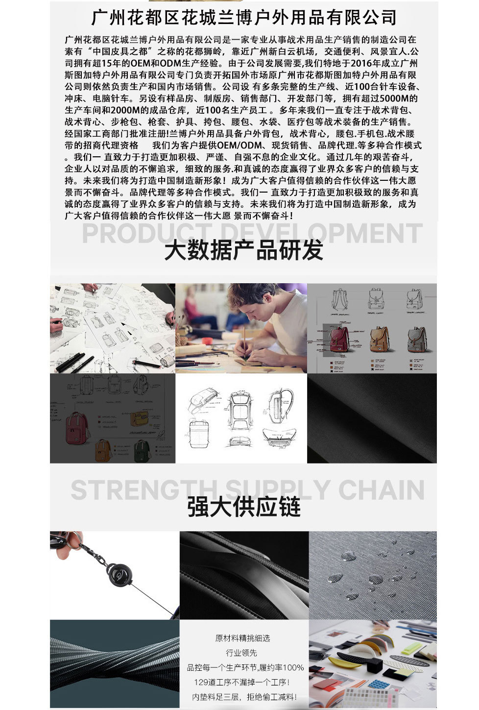 广州市花都区花城兰博户外用品厂是一家集设计、生产、销售于一体的实业公司.本公司主要生产销售:户外背包、战术腰包、战术腰带、战术背心、战术狗包,以及各种医疗包.本公司拥有完整、科学的质量管理体系。自有生产工厂,多名老员工在户外产品领域有着丰富的设计、生产经验,我们秉承服务优质、全面周到,产品质量优,价格低等优势占有市场,在产品的设计、包装、质量上不断的提升,以满足大量新老客户的需求,产品远销海外。专门为国内外贸易公司、实体店、网上店铺(速卖通、EBAY、WISH、亚马逊、天猫,淘宝C店,京东)等店铺供应大量现货。接受来样加工生产,贴牌。