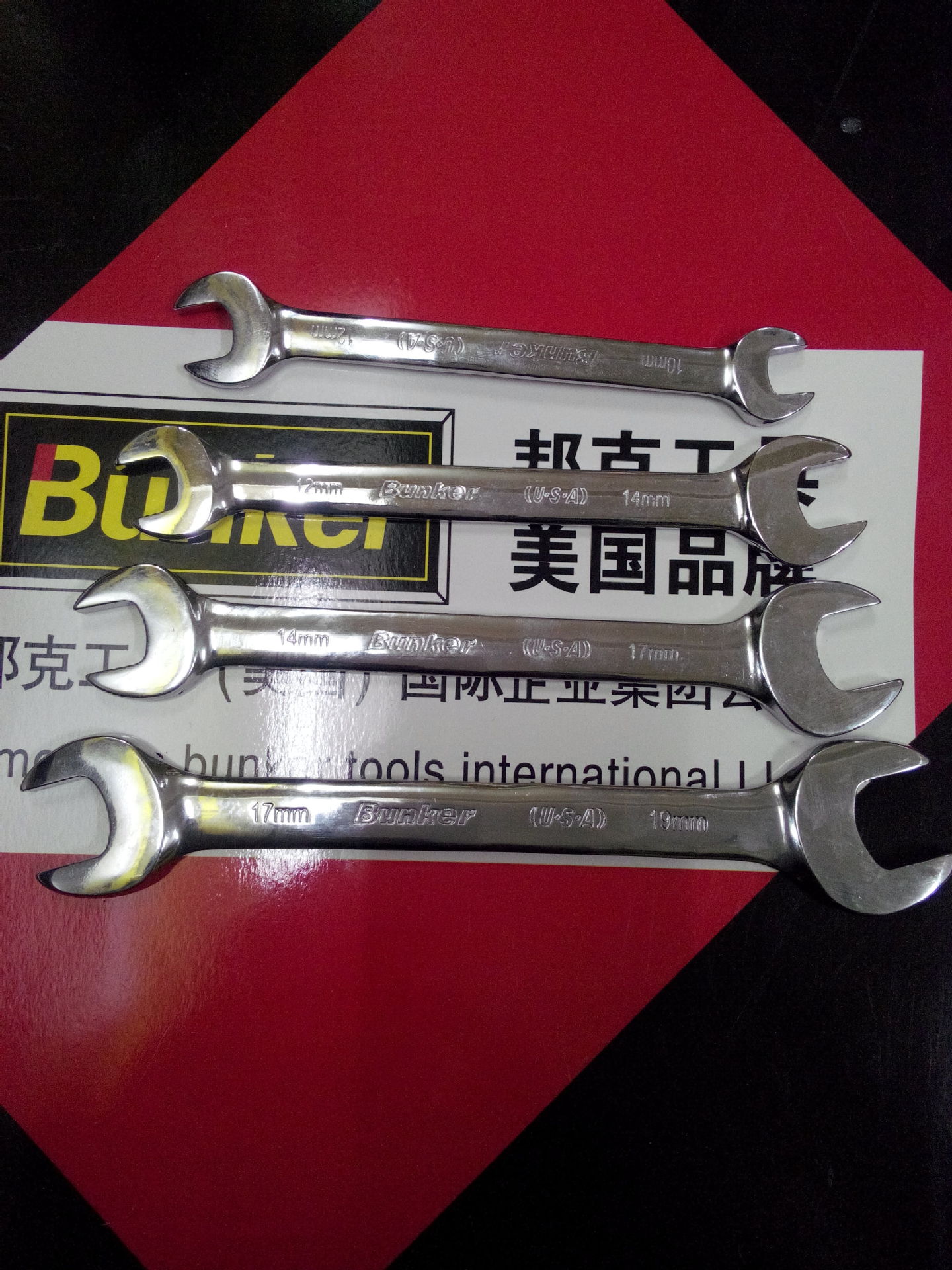 美国邦克品牌开口扳手采用铬钒钢精工锻造,美国标准,加长加厚。表面镜面全抛光,用于快速拆卸和紧固六角和方头螺丝,使用寿命更长久。   广泛应用矿山、冶金、造船、电力、汽修等行业。    美国品牌邦克工具浙江省总邦克工具所有产品一律以出厂价销售,产品绝对正宗,质量保证,不求利润,只求销量。请放心购买。地址;永康五金城一期市场三街50-52号。