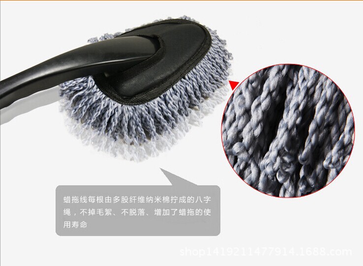 【产品优点】 1、韩国ALILON超细纤维除尘蜡拖,采用擦拭光学镜头所用的超细纤维材料,特别柔软,不易划伤车漆表面。刷毛由超细纤维制成,其超强的吸附力可方便的去除车身表面的灰尘和污垢 2、创新科技,产品的超细纤维抗菌防霉,使用中不掉毛,不产生碎屑,不损伤车身漆面,轻巧耐用,美观精致。 3、抗菌性优秀,可抑制细菌及发霉。 4、超长使用寿命,可拆卸式的棉刷头方便清洗并可反复清洗,人体工程学设计超级软把手,手感柔软舒适,既防滑又轻巧,增加握力可轻松操作。 5、把手使用高强度工程塑料,坚韧不断裂。使用时,无需沾水,只要用棉纱接触车体表面,轻轻檫试一遍,即实现除尘、上光一次。而且吸尘功效持久耐用,能使任何角落的灰尘不再满天飞。使用后能使汽车表面恢复亮利光泽,且不磨伤汽车表面。使用完毕只需轻轻抖动除尘蜡拖,就能消除掸内灰尘。这样省钱、省时、高效、又可避免常用水洗带来的不良影响和打蜡次数的蜡拖,让你的车越来越亮,手柄可随意调整长短,不用时可用塑料罩套起来,延长蜡把使用时间!不损伤漆面,采用高科技绞丝技术。