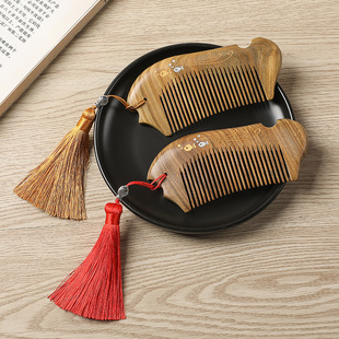 | 天然绿檀木梳子带穗檀木梳防静电刻字大宽齿家用脱发按摩卷发梳 | |