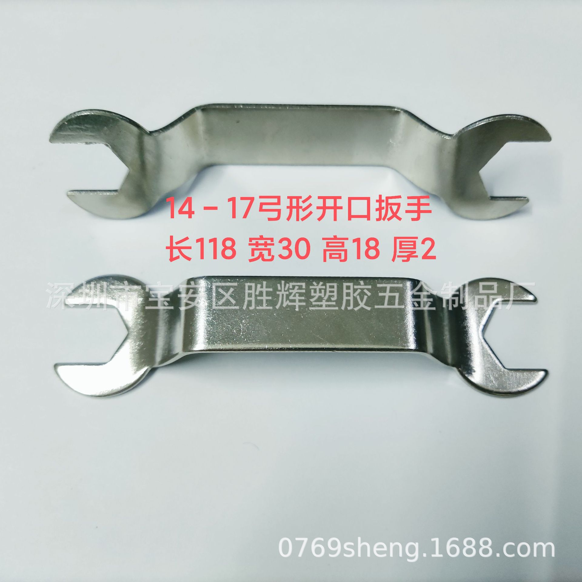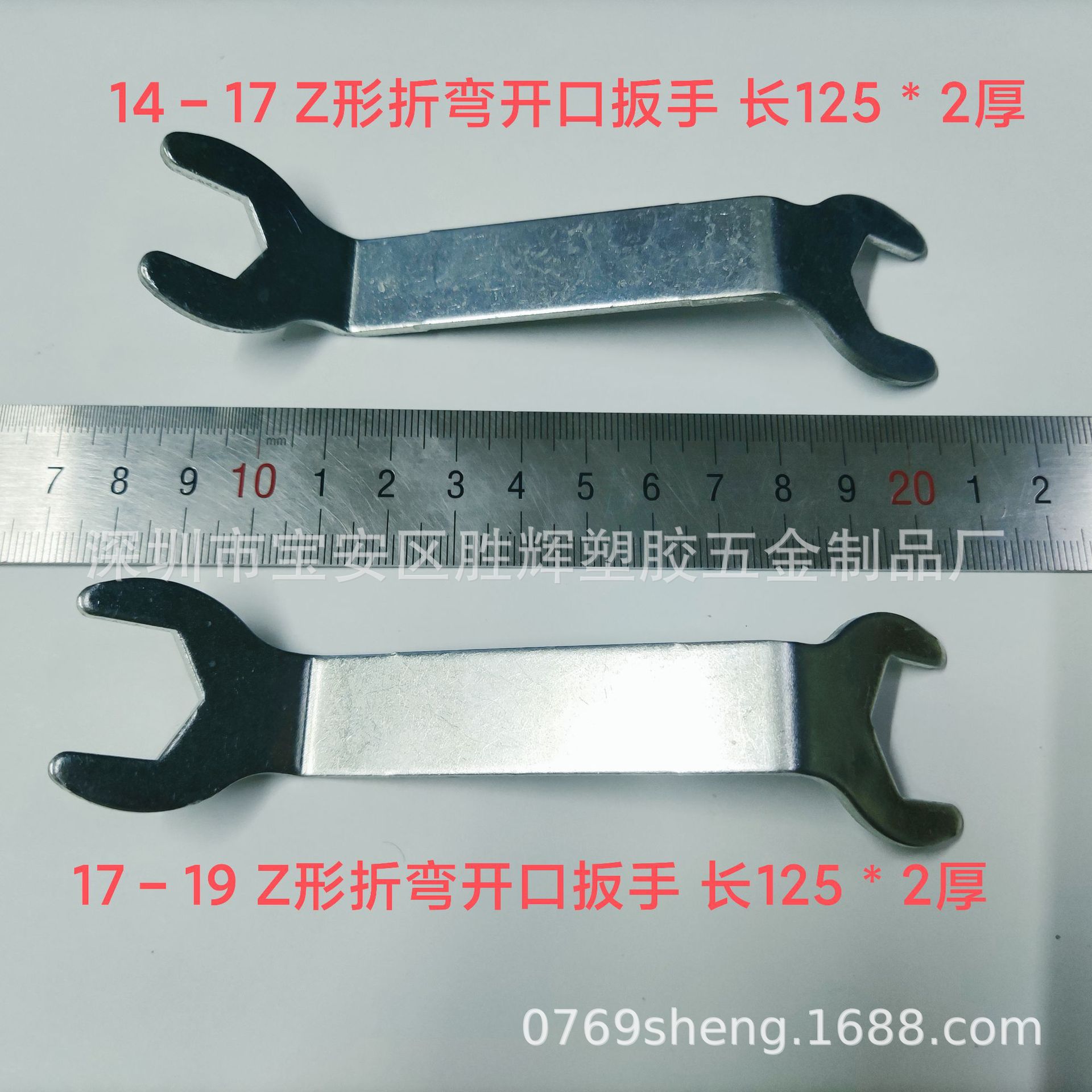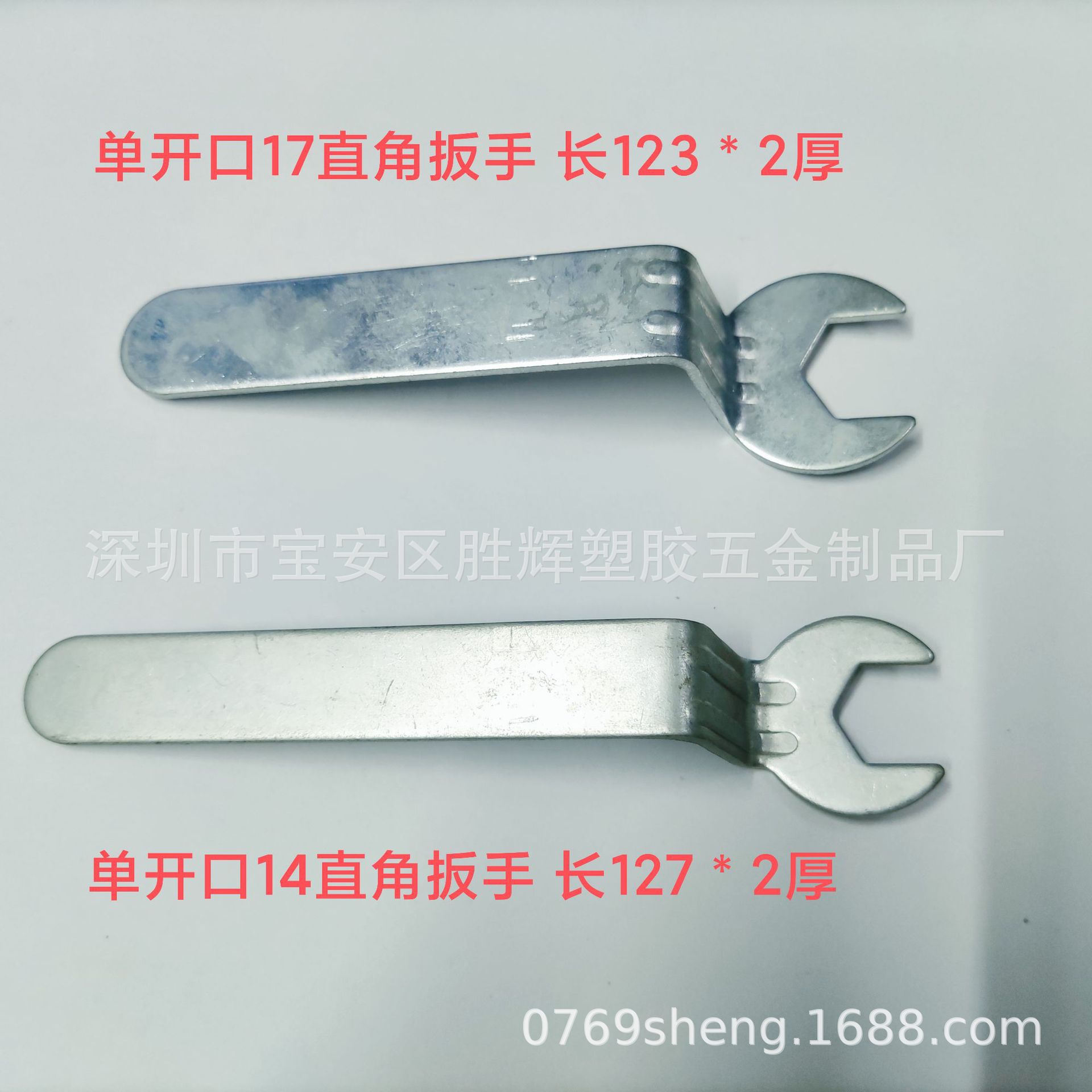 开口 17-19 直角折弯带加强筋两用扳手规格 长 145mm 宽35mm 高度25mm 厚度 2mm带两条加强筋 折弯处不易变形电镀 白锌产品 单重 43g需要的朋友 请马上