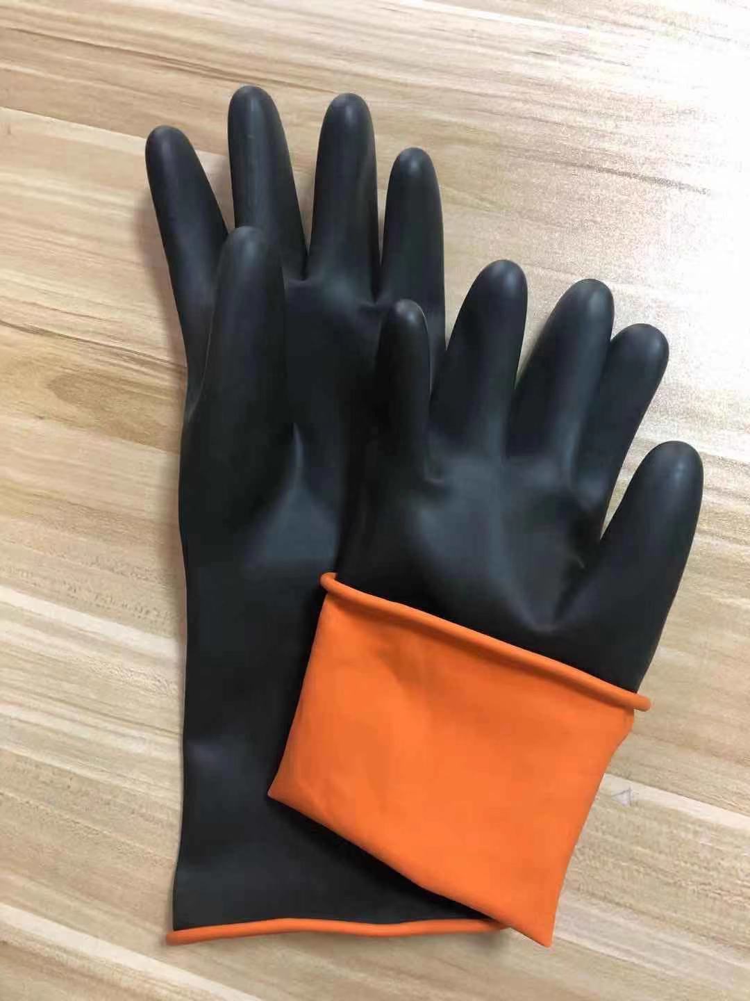 产品说明: 分黑色和内橙外黑两种工业乳胶手套采用的天然乳胶,配以其它的助剂采用特殊工艺精制加工而成,产品、;具有拉力好,贴附性好,灵活使用。