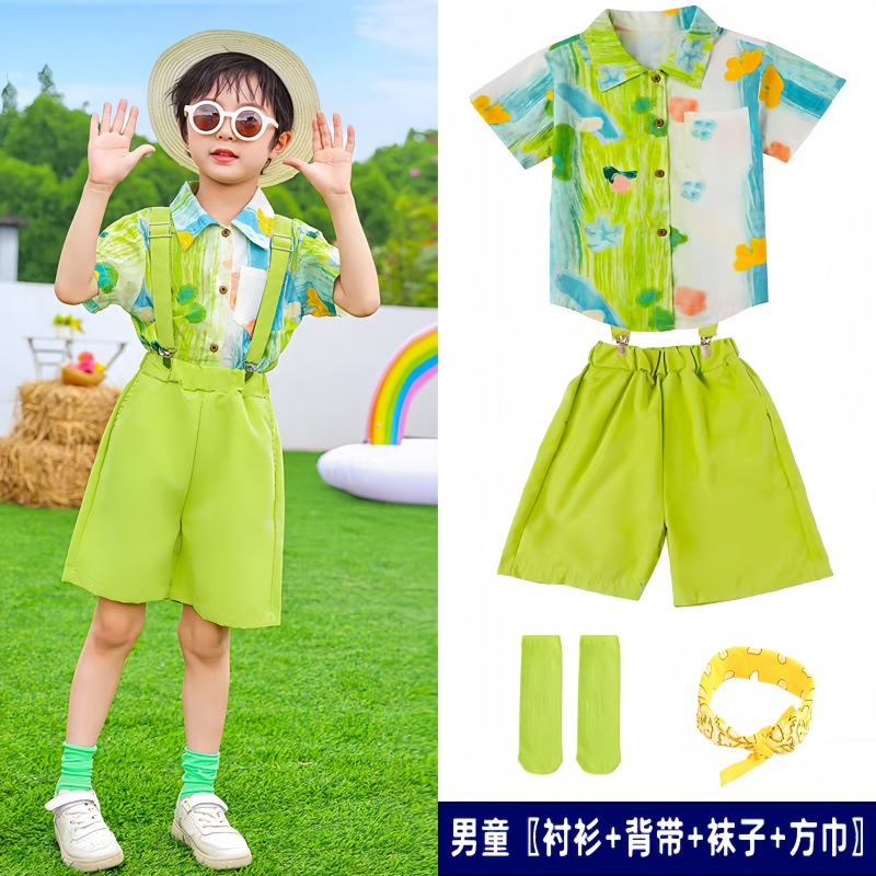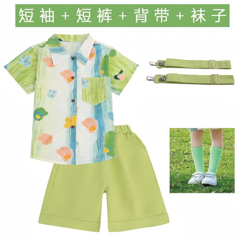 • (남학생) 녹색 쓰리피스 슈트 (반팔 셔츠 + 서스펜더 반바지 + 무료 양말)