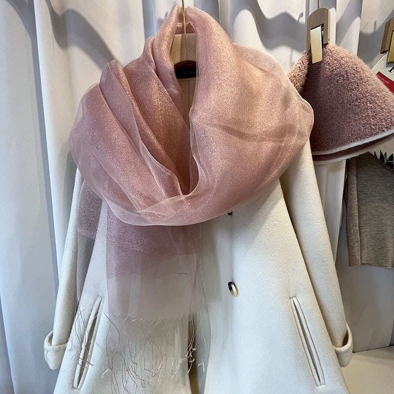 2022 봄과 가을 원피스 숄 더블 레이어 대비 골드 실크 술 실크 오간자 스카프 뽕나무 실크 롱 스카프스토어 가기