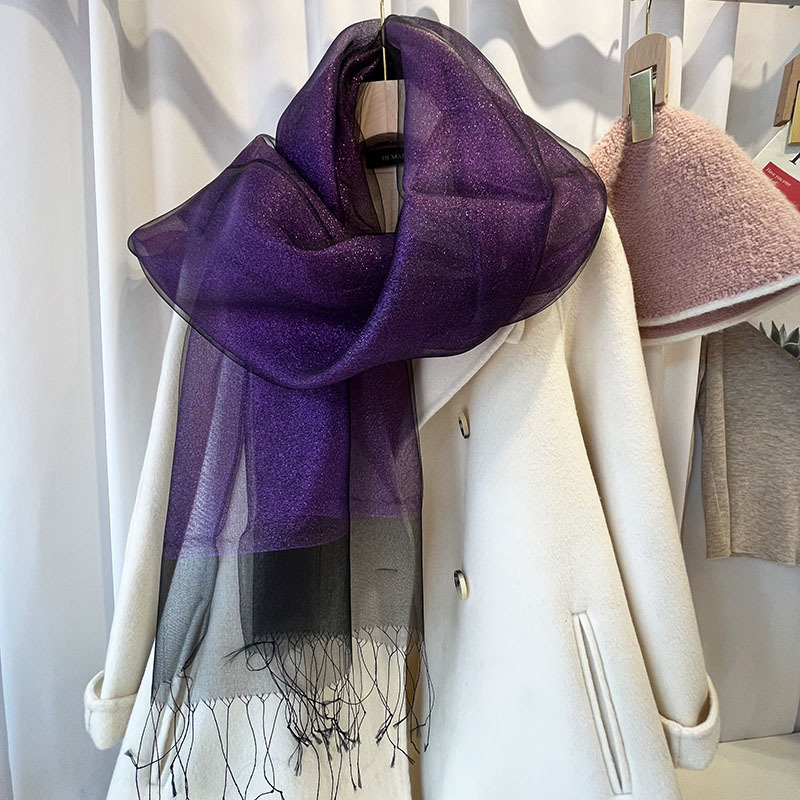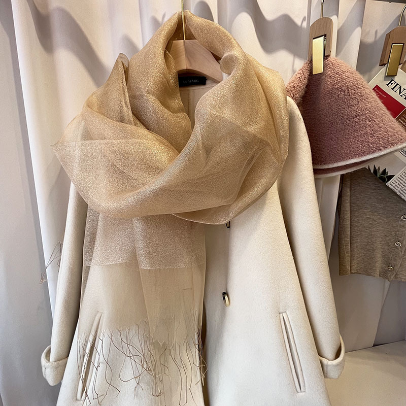 2022 봄과 가을 원피스 숄 더블 레이어 대비 골드 실크 술 실크 오간자 스카프 뽕나무 실크 롱 스카프